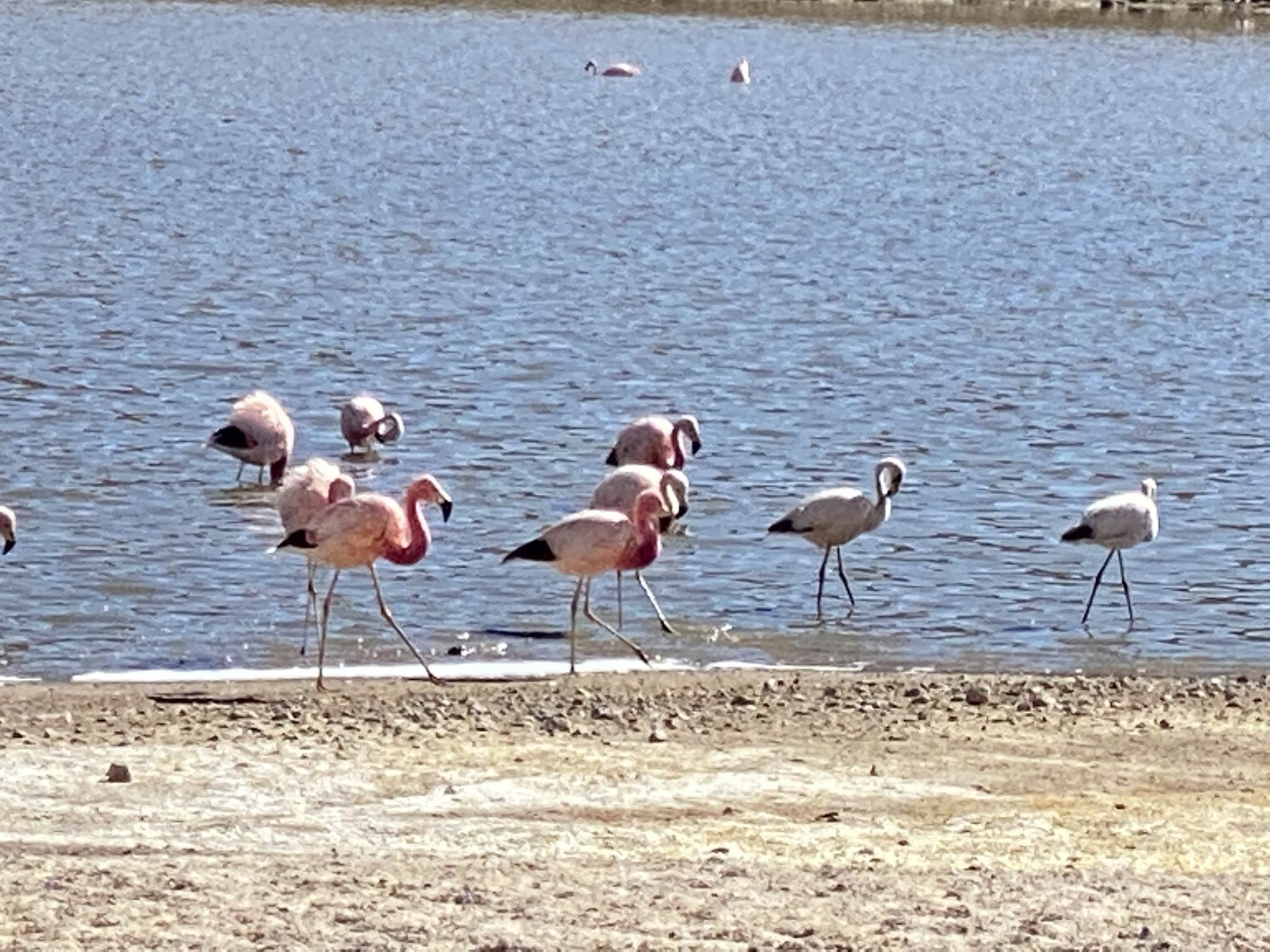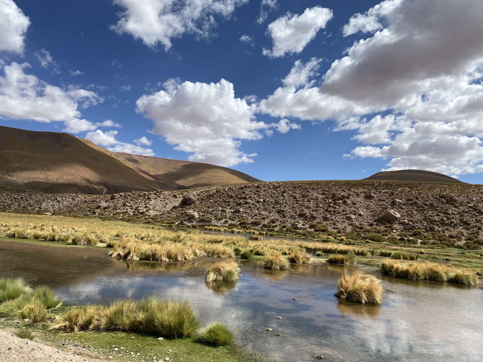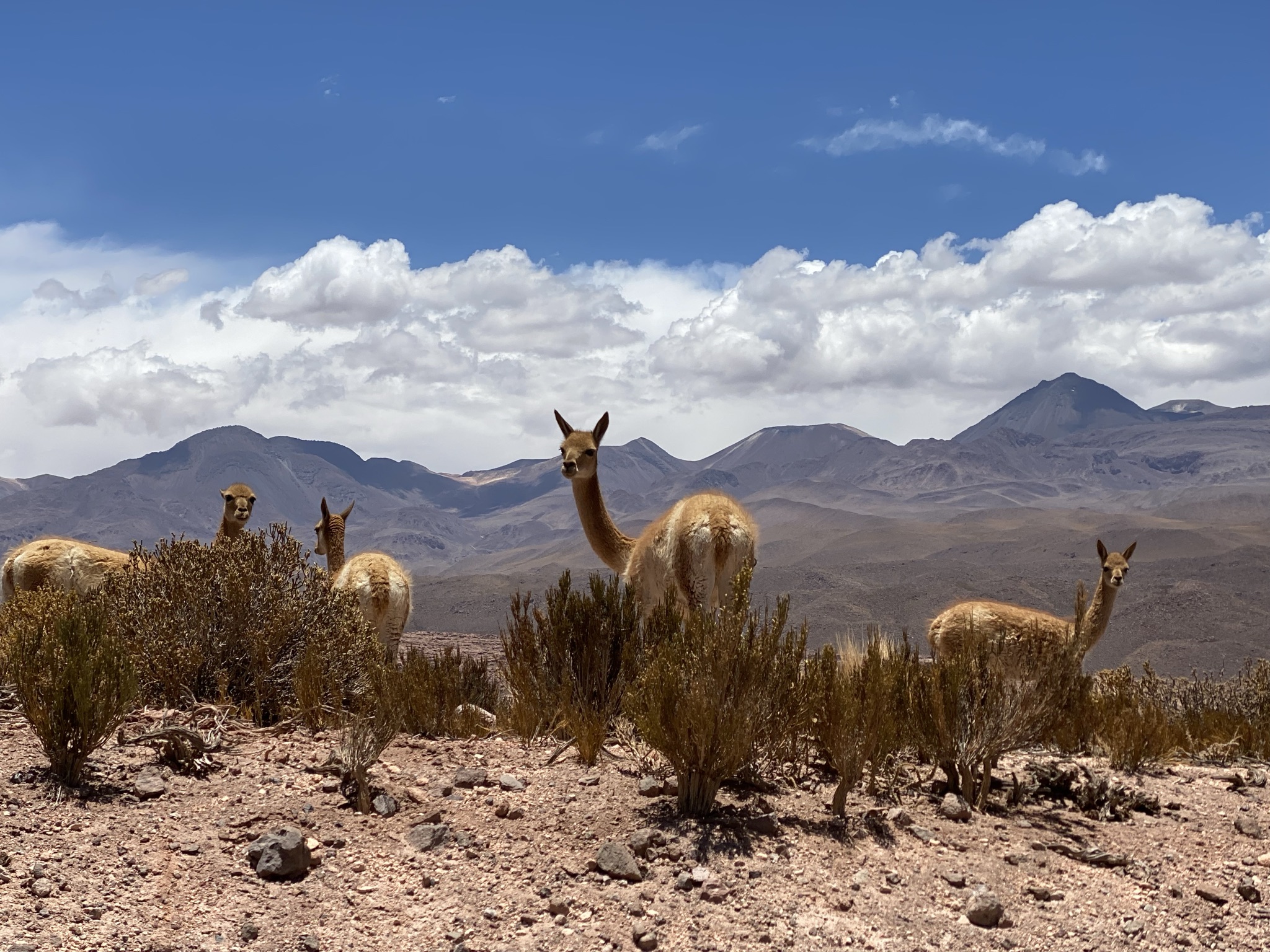 The next day we went to Los Flamencos National Reserve. It was another bumpy dirt road with lots of curves and steep climbs. We reached an altitude of 13,000 feet and were not far from the Bolivian border. We saw hundreds of flamingos in a lagoon. At one point some took flight. We are told that is a rare sight. The different high-altitude ecosystems we drove through were so diverse. A favorite was the wetlands. The mirror-reflection lagoons, surrounded by yellow grass with the backdrop of mountains and volcanoes were amazing. We watched orange-footed coots feeding their babies and saw blue-billed ducks, a fox, and grazing vicuna. Vicunas are related to the llama and are believed to be the wild ancestor of the domesticated alpaca. They are one of two wild South American camelids which live in the high alpine areas of the Andes. After another snack buffet in the wilderness and we headed back into San Pedro de Atacama.