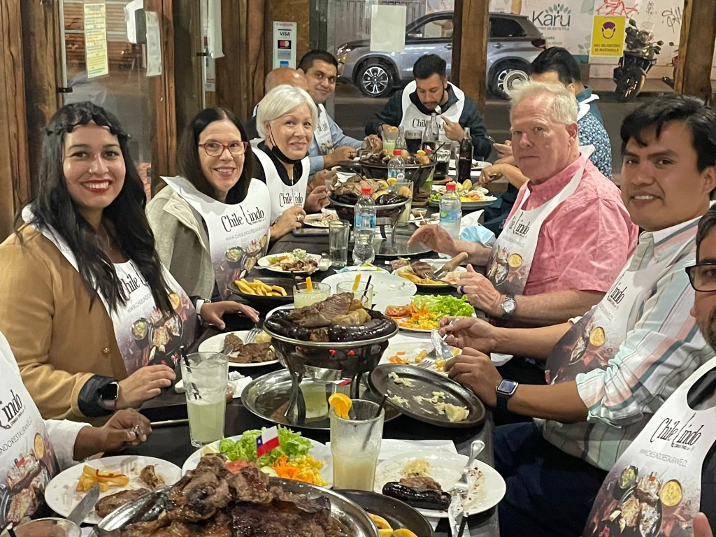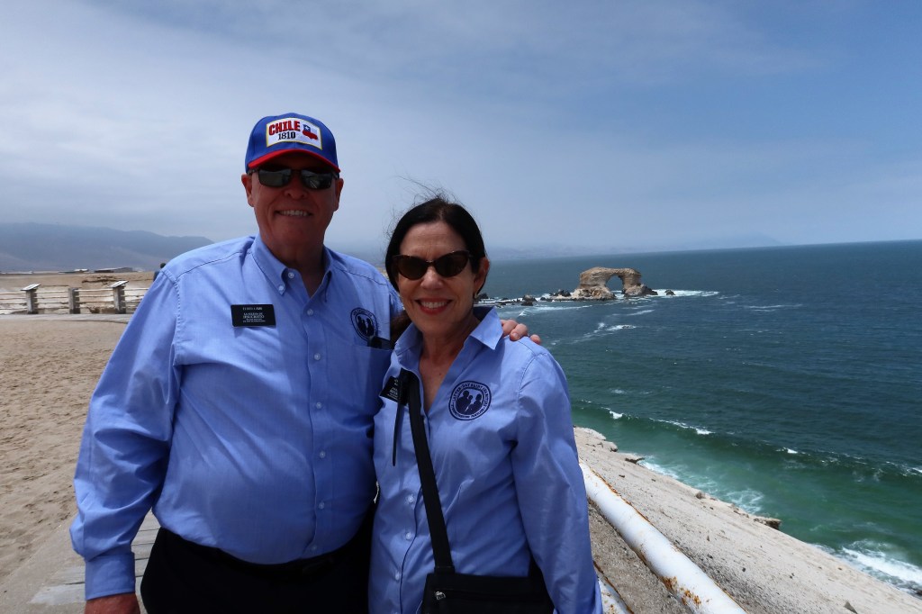 While in Antofagasta we were able to meet Élder y Hermana Woodhouse, temple construction missionaries. They are from NYC and have lived all over the world as he served in the Airforce with duty stations in Hawaii, Azores, and Panama. They raised their four children mostly in San Antonio. They arrived in Chile three weeks ago and will be here until the temple is finished which will take two to three years. We stood on their 19th-floor apartment balcony to see the temple site and then we got a close-up view from their office balcony on the temple block. This is their second mission. They served as humanitarian missionaries in the Dominican Republic and were only home for 6 months before coming to Chile to serve. We visited La Portada, a picturesque archway, created by Mother Nature. The temple contractor hosted a Christmas dinner and we were invited to join them. It was a typical Chilean barbeque (a la Parrilla or Asado.)