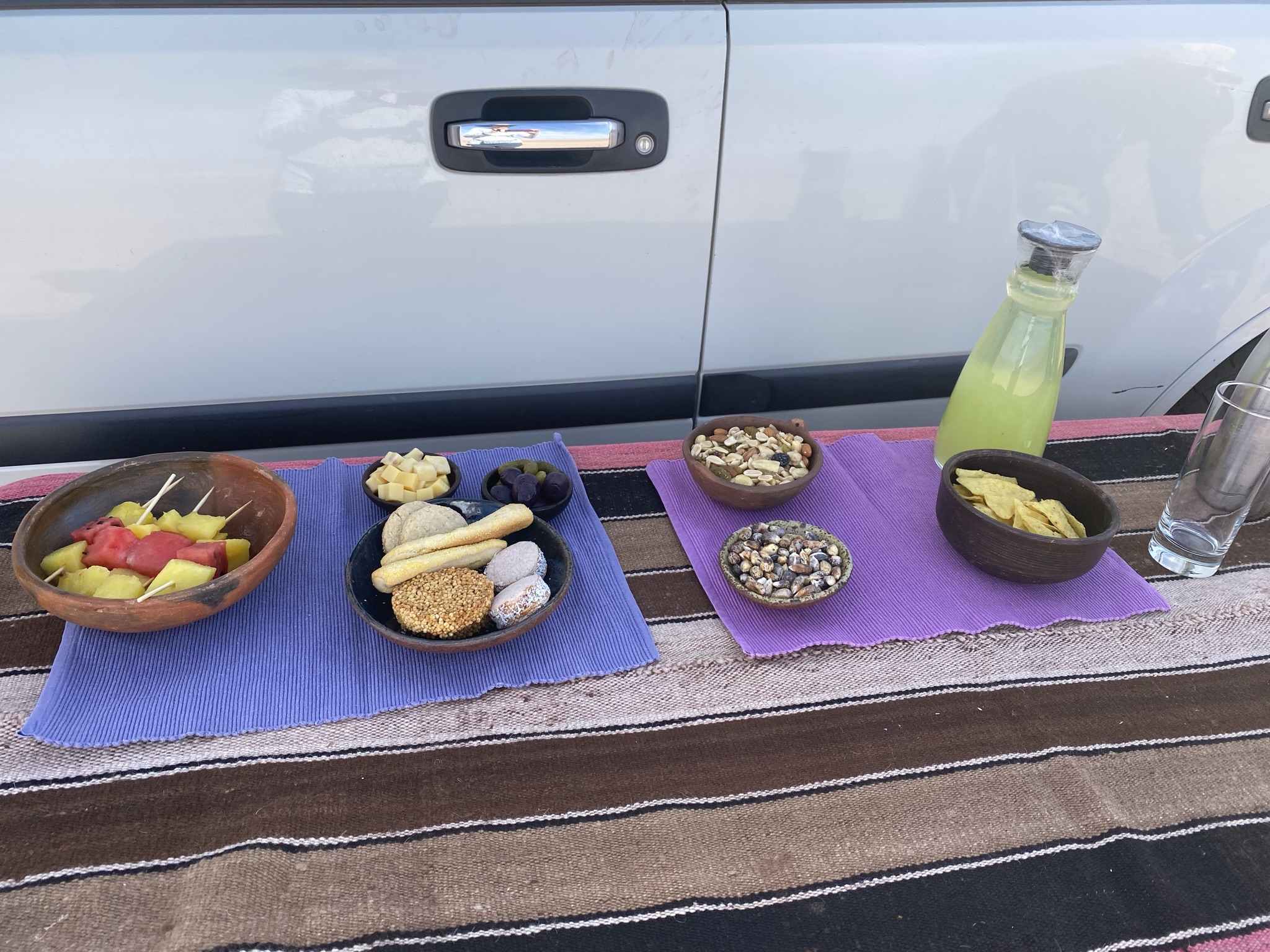 One afternoon we crossed the Cordillera Salt Flats on a washboard gravel road. It was utter desolation. It made the Nevada/Arizona deserts look lush. We came upon some saltwater lagoons with turquoise and green water surrounded by white salt deposits. This icy water in the middle of the driest desert in the world was a true oasis. It was an interesting sensation to feel weightless in the water. Our wonderful guide had a garden sprayer ready to rinse us off with clean water. On our way back to the hotel he stopped at the side of the road, pulled out a table, tablecloth, and an afternoon snack with cool melon juice. This outdoor meal service reminded me of our African Safari.