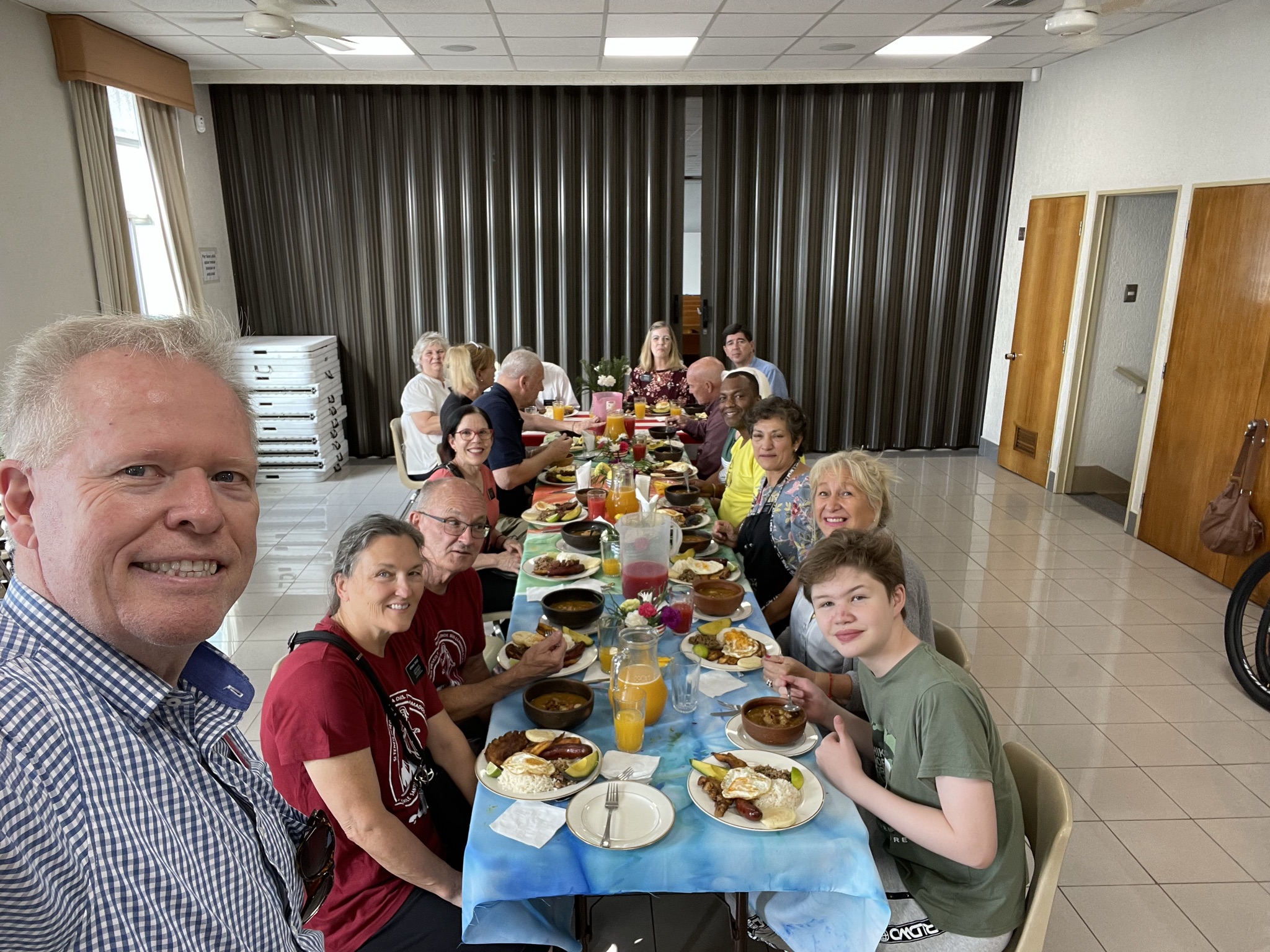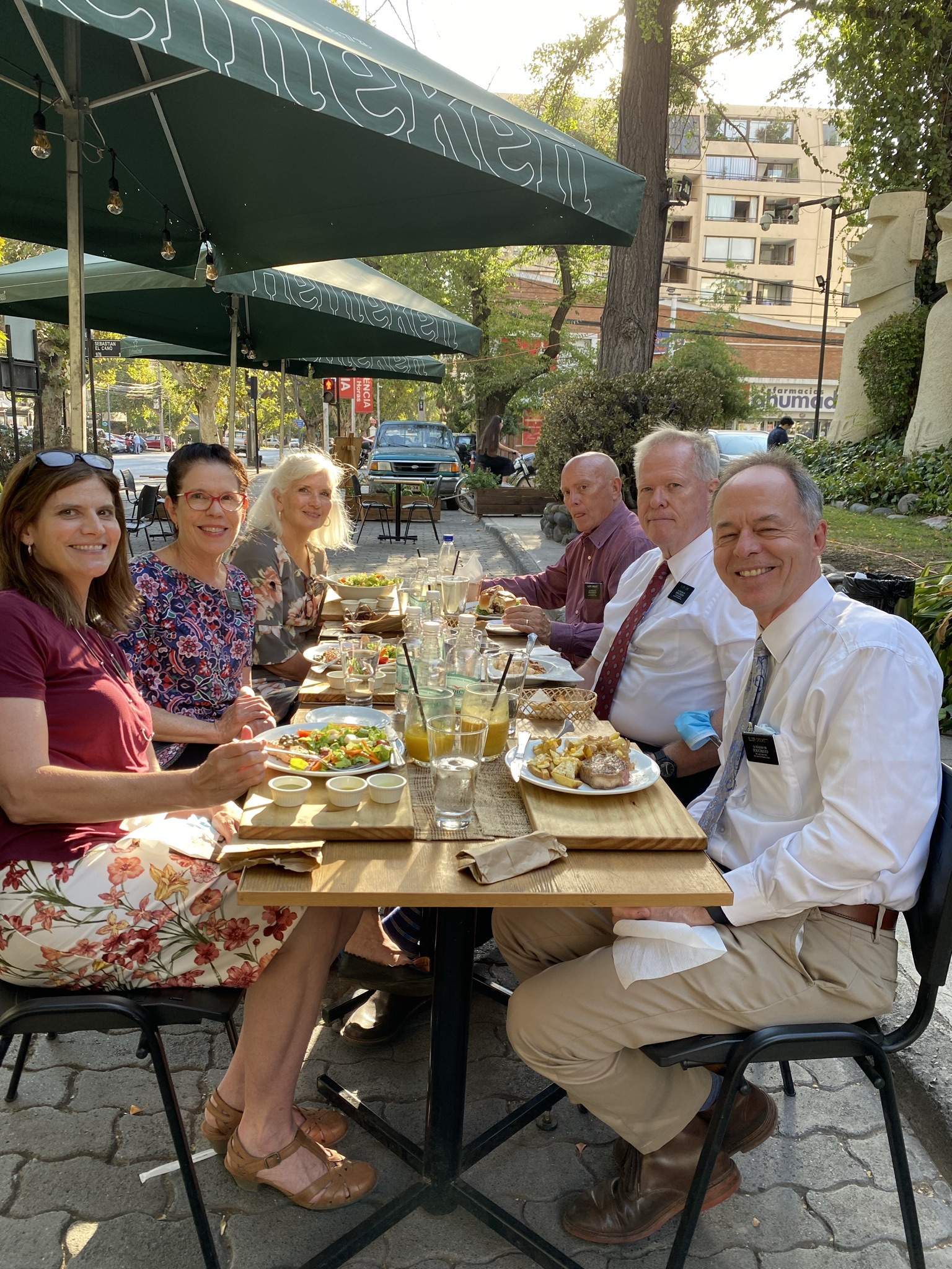 We spent most of Saturday in the office catching up on paperwork and correspondence that we had received all week while we were out of the office. The truck came to load the Concepción supplies so that cleared out a space for us to count out next week’s items for Santiago North PFJ at Casablanca. While at the office, Sister Mendez texted to invite us to a Columbian dinner she was preparing for the Santiago North Mission office missionaries. We hurried to finish our work and took an Uber to their office. Sister Mendez and a Columbian chef had worked all day to prepare a typical Columbian meal. It was so kind of her to invite us! It was lovely to meet these good missionaries. President & Sister Simpson (mission president & companion), Sister Mendez (executive secretary to the president), President & Hermana Esmiol (counselor & secretary), Elder & Hermana Cook (vehicles & finance), Elder & Hermana Grange (housing) Sister Maria Cecilia Garcia Rodriguez was also in attendance. Sister Ferguson had told us about her. She collects clothes for refugees and has presented projects to previous humanitarian missionaries. She has a service heart. It was wonderful to make connections with these good people.