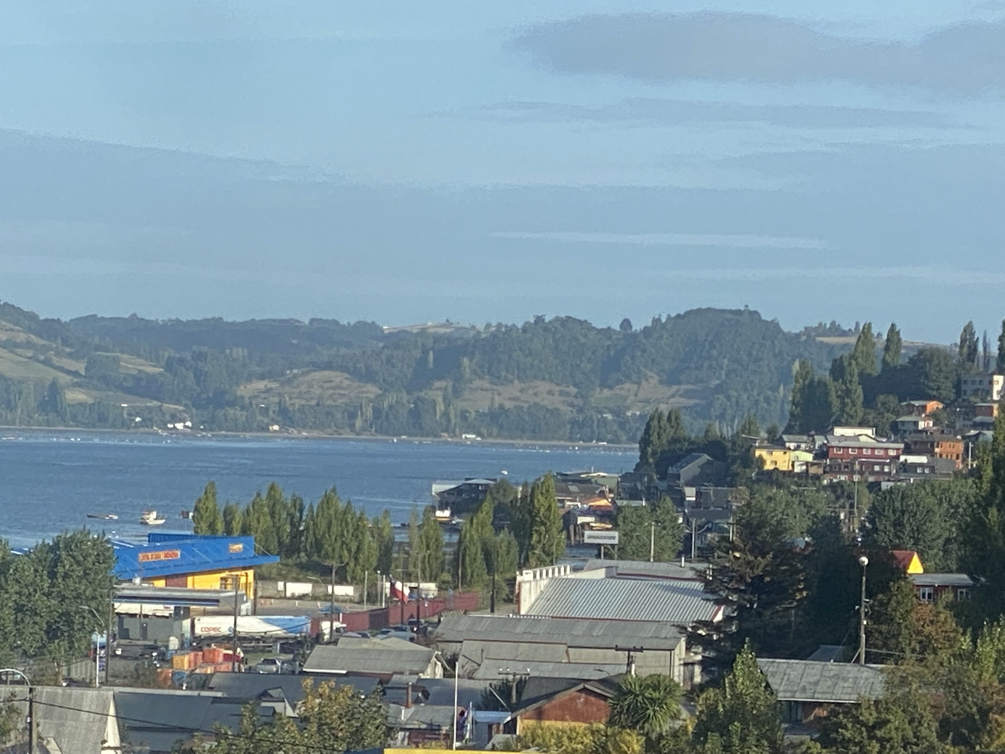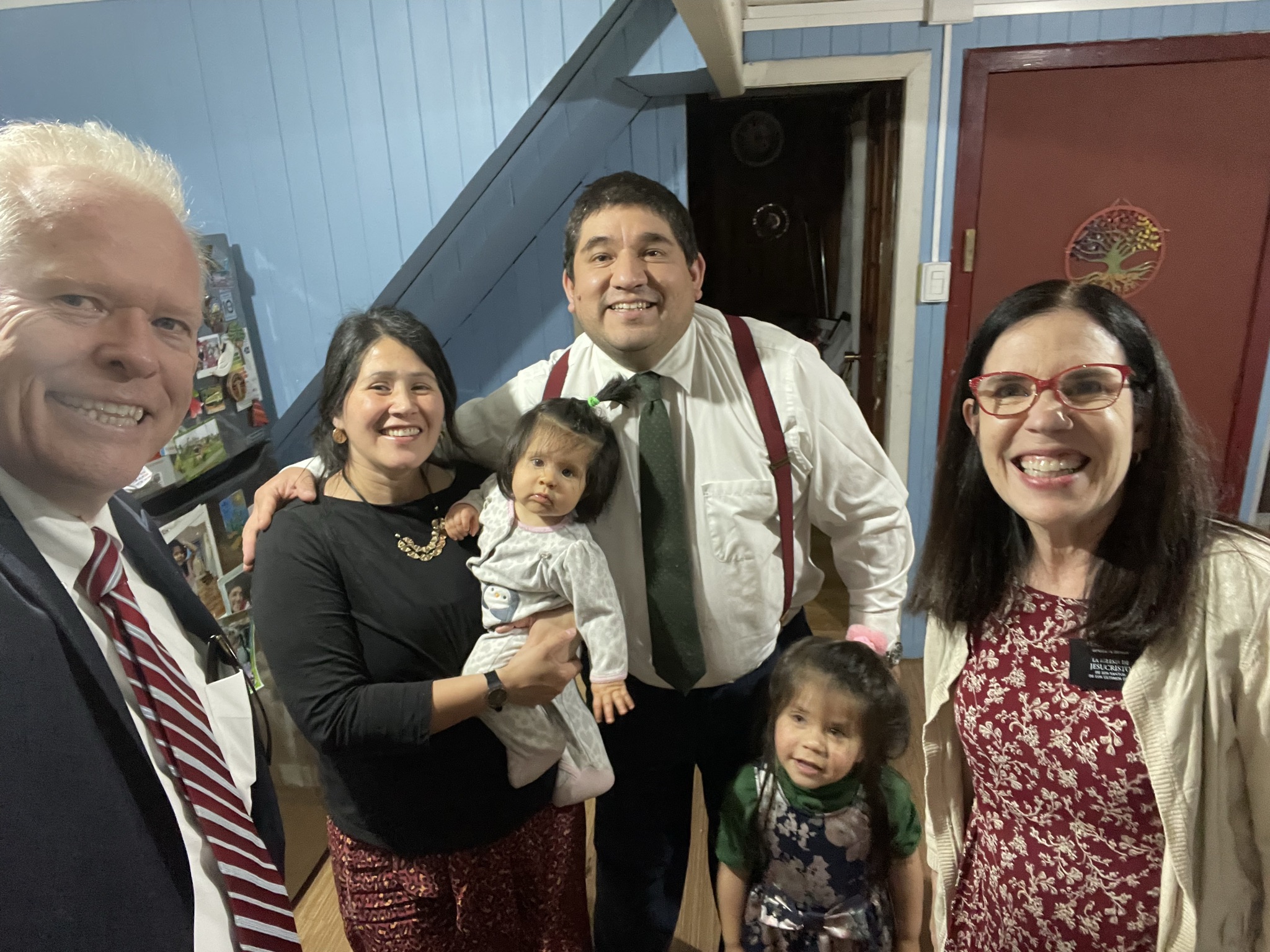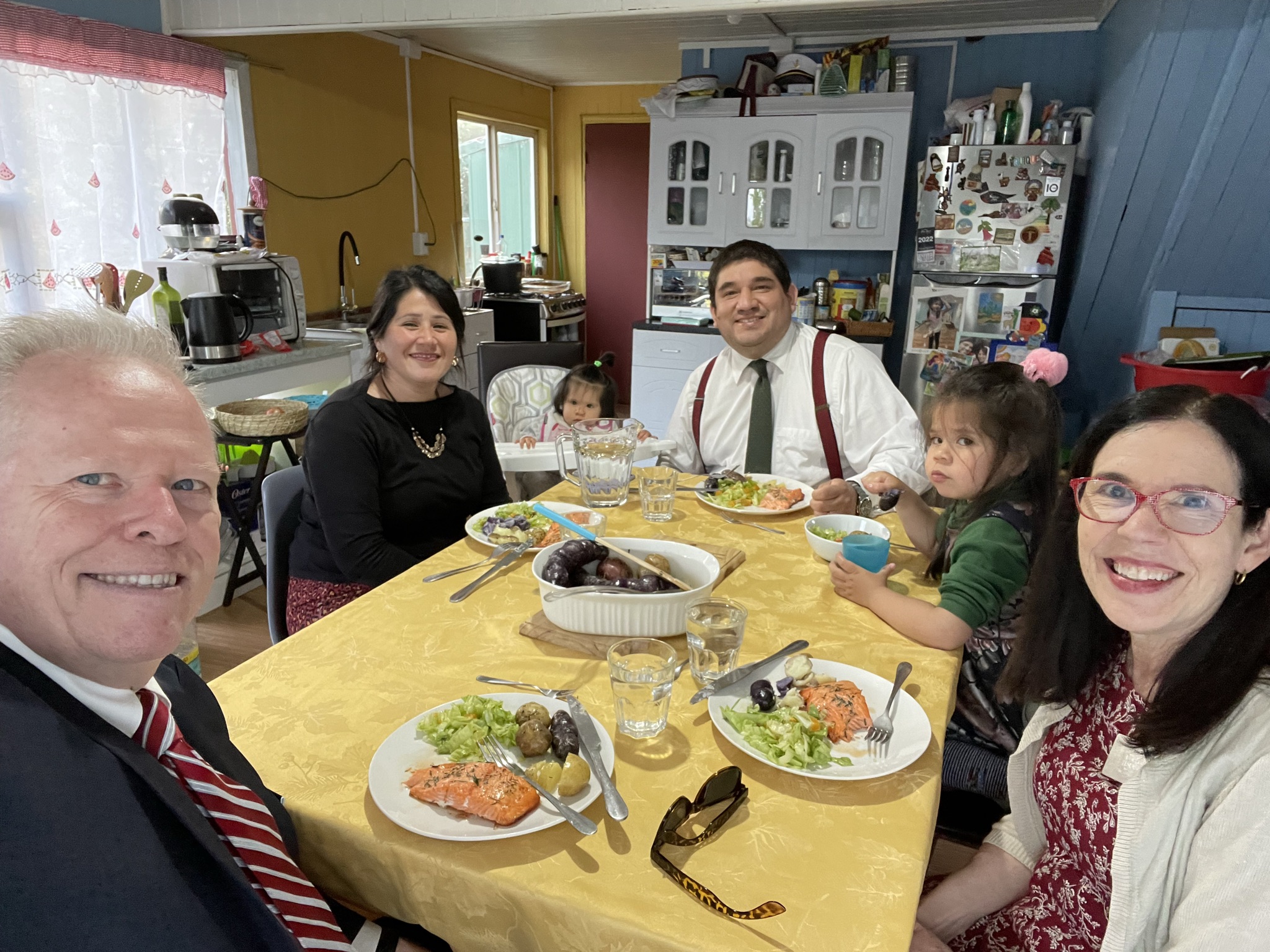 Last Sunday we had dinner in the home of the Sanchez family in Castro on the island of Chiloe. This branch president has a young family. His wife had prepared a delicious salmon dinner for us with rosemary potatoes and a salad with a peach tart for dessert. It was so kind of them after a long day of church meetings to have in their home for a rather late dinner. They lived in a remote part of Castro, out in the country on a steep gravel road.