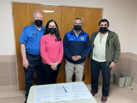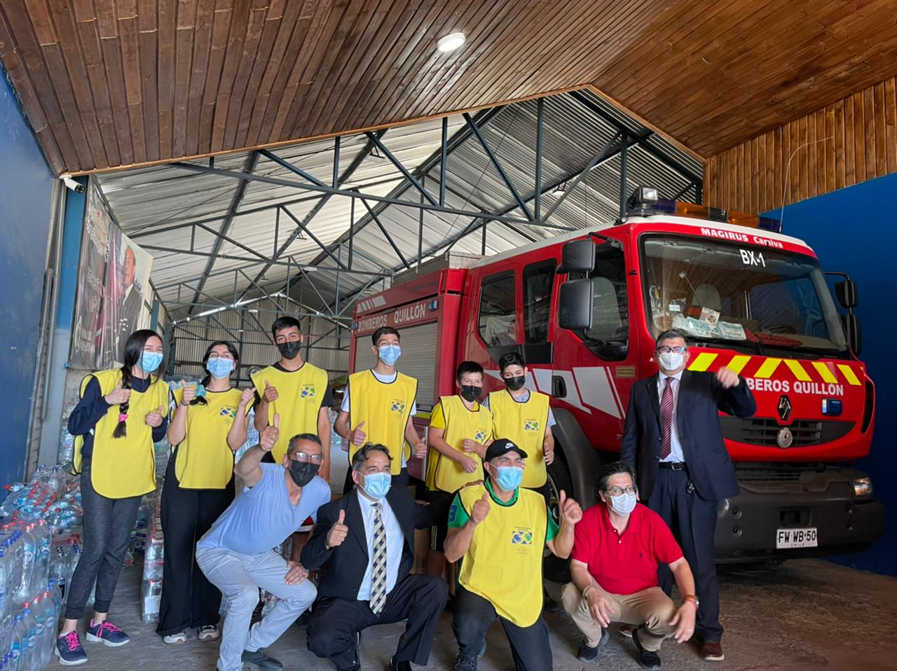 Raul Seguél, one of our field managers, picked us up at our hotel in Chillán to drive to Quillón. The 45-minute drive turned into 1 ½ hour because of construction on a bridge. As we sat in standstill traffic, Raul purchased several snacks for us from roadside vendors; flatbread with bacon in it and chocolate cookies filled with manjar (a caramel-like spread). We arrived at the chapel just in time for the signing for the Quillón Bomberos emergency project. During a recent forest fire, Latter-Day Saint Charities donated emergency supplies for the fighters such as water, eye drops, and sunscreen.
