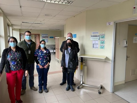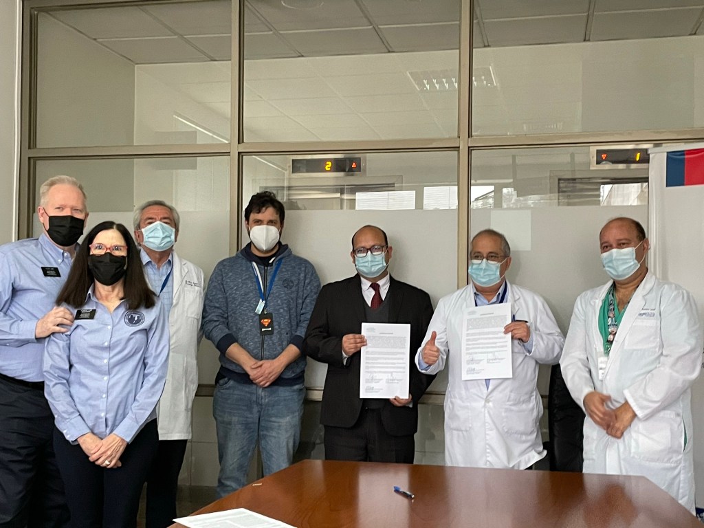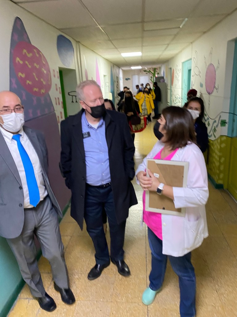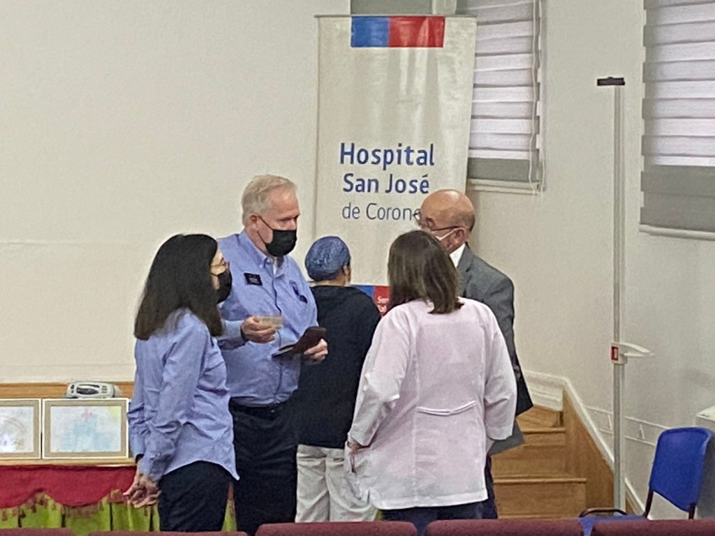 An hour’s drive south found us at Hospital Coronel for another ceremony. Hospital San Jose de Coronel is the only hospital in a town of 126,000 inhabitants. They also serve surrounding communities. Coronel was historically a mining center, with a high level of unemployment and its inhabitants are of limited economic resources. The pediatric department cares for a population of 26,000 children under the age of 15. They currently have the capacity for 27 children with combined incubators, cribs, and beds. The most frequent hospitalizations are due to respiratory infections. The requested equipment: an oximetry monitor, otoscopes, ophthalmoscopes, secretion pumps, and scales will greatly improve treatment for pediatric patients. Because they now have monitors, children do not have to be transferred to Concepcion for observation and treatment.