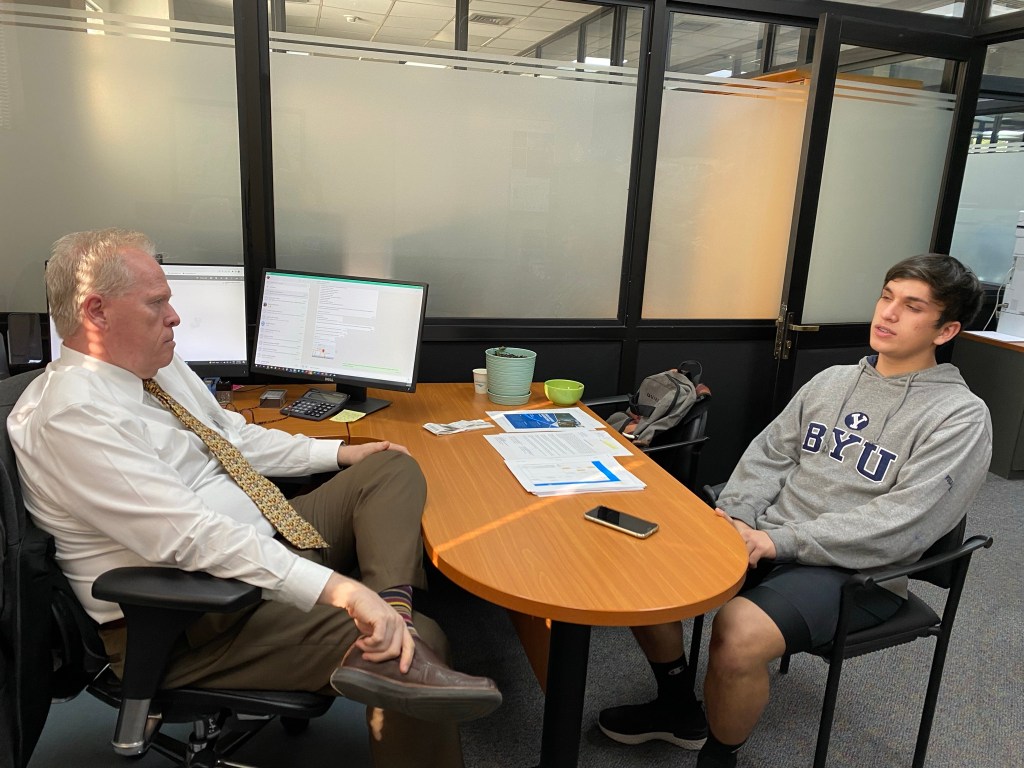 On Tuesday afternoons Benjamin Ramirez comes to our office and practices English with Élder Lamb. He is a senior in high school and is preparing to go to the United States to attend college next year.