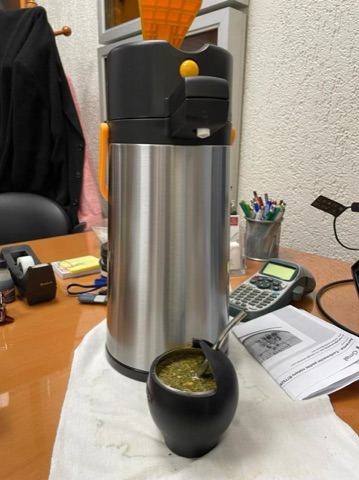 Maté is a traditional South American drink made by soaking the dried leaves of a species of holly in hot water and is served with a metal straw in a container typically made from a gourd. As we met with our buyer this week, he was preparing his mate. People typically bring a large thermos of hot water with them to work, and they sip on their mate all day long.