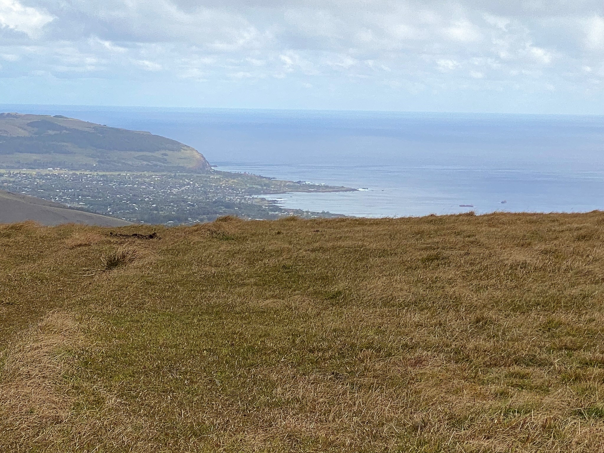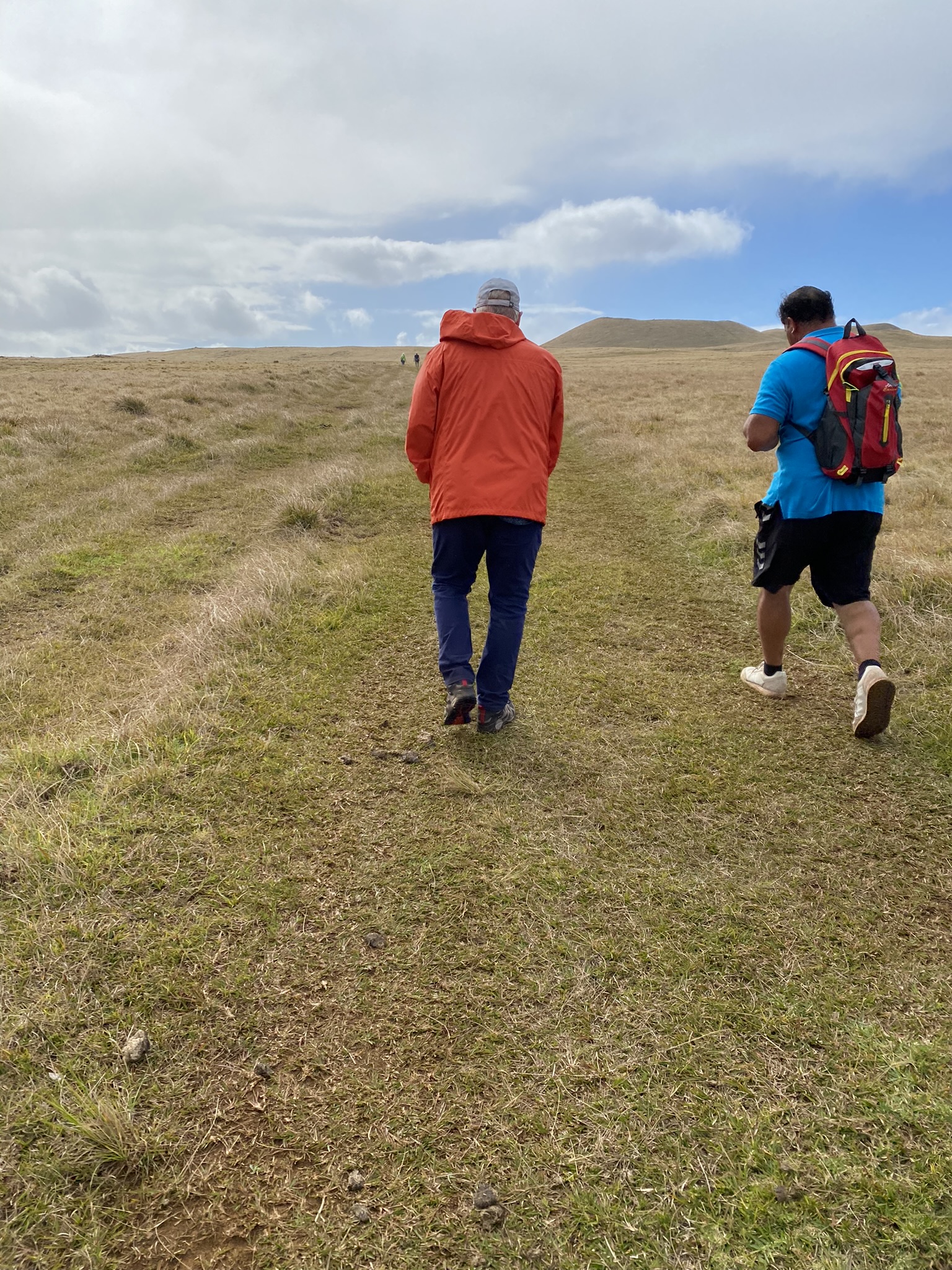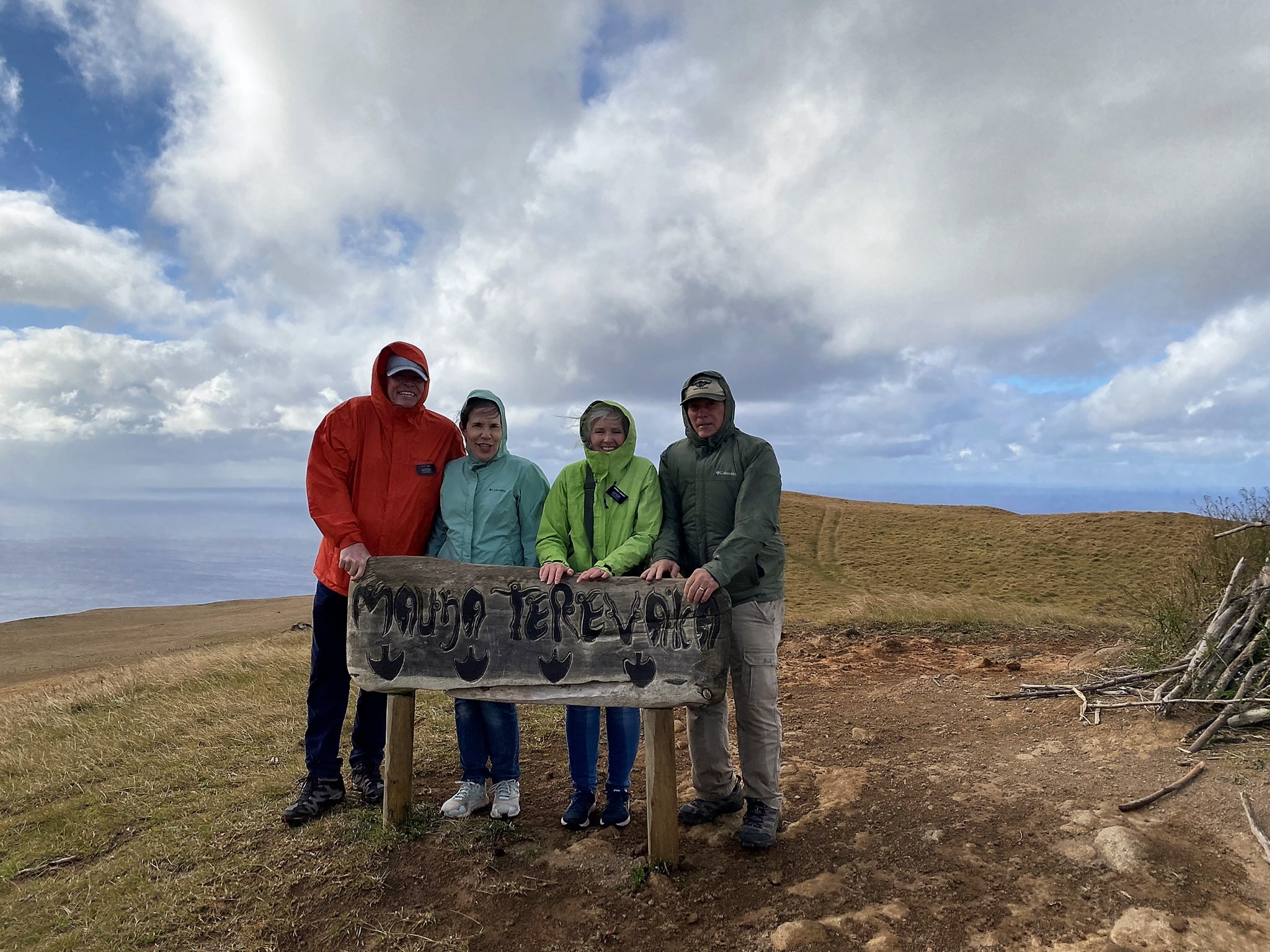 We made the three hour round trip, 6 ½ mile hike up the Maunga Terevaka volcano, the youngest of the three main extinct volcanos that form the island. Intermittent rain showers and a lot of wind followed us as we climbed. There was a beautiful rainbow that appeared for a few minutes and encouraged us onward. At the top, we stood on the highest point on Easter Island. At 511 meters (1,676 ft) its summit offers a 360 panoramic view of the island and surrounding ocean.