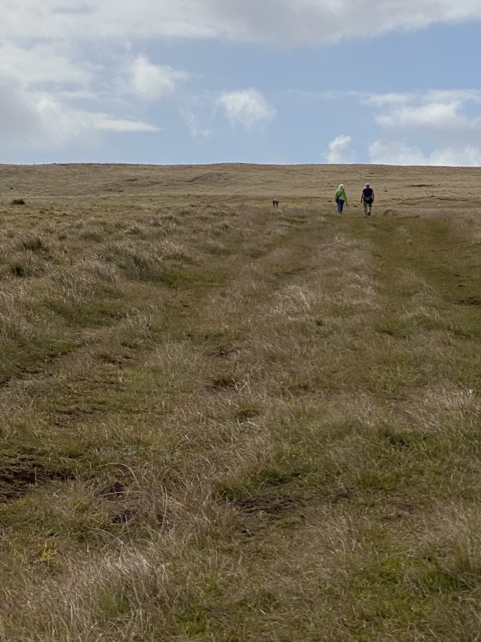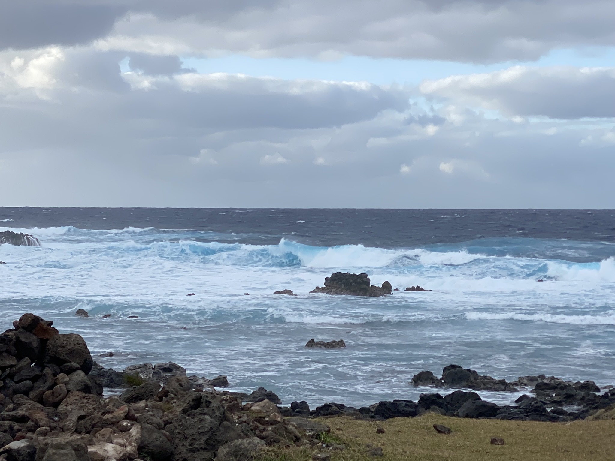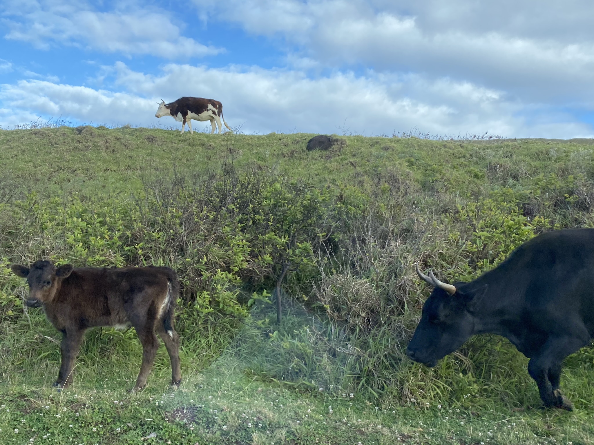 We made the three hour round trip, 6 ½ mile hike up the Maunga Terevaka volcano, the youngest of the three main extinct volcanos that form the island. Intermittent rain showers and a lot of wind followed us as we climbed. There was a beautiful rainbow that appeared for a few minutes and encouraged us onward. At the top, we stood on the highest point on Easter Island. At 511 meters (1,676 ft) its summit offers a 360 panoramic view of the island and surrounding ocean.