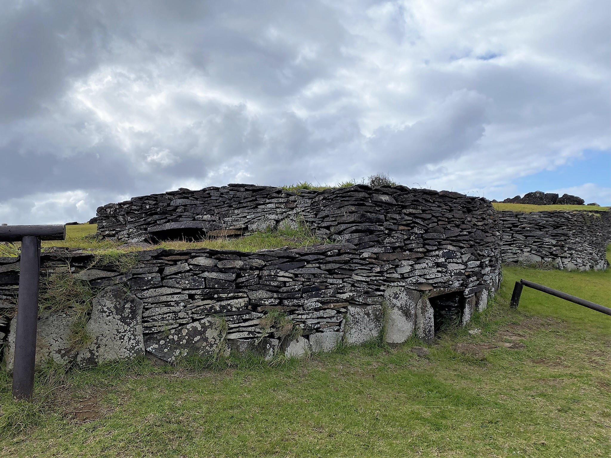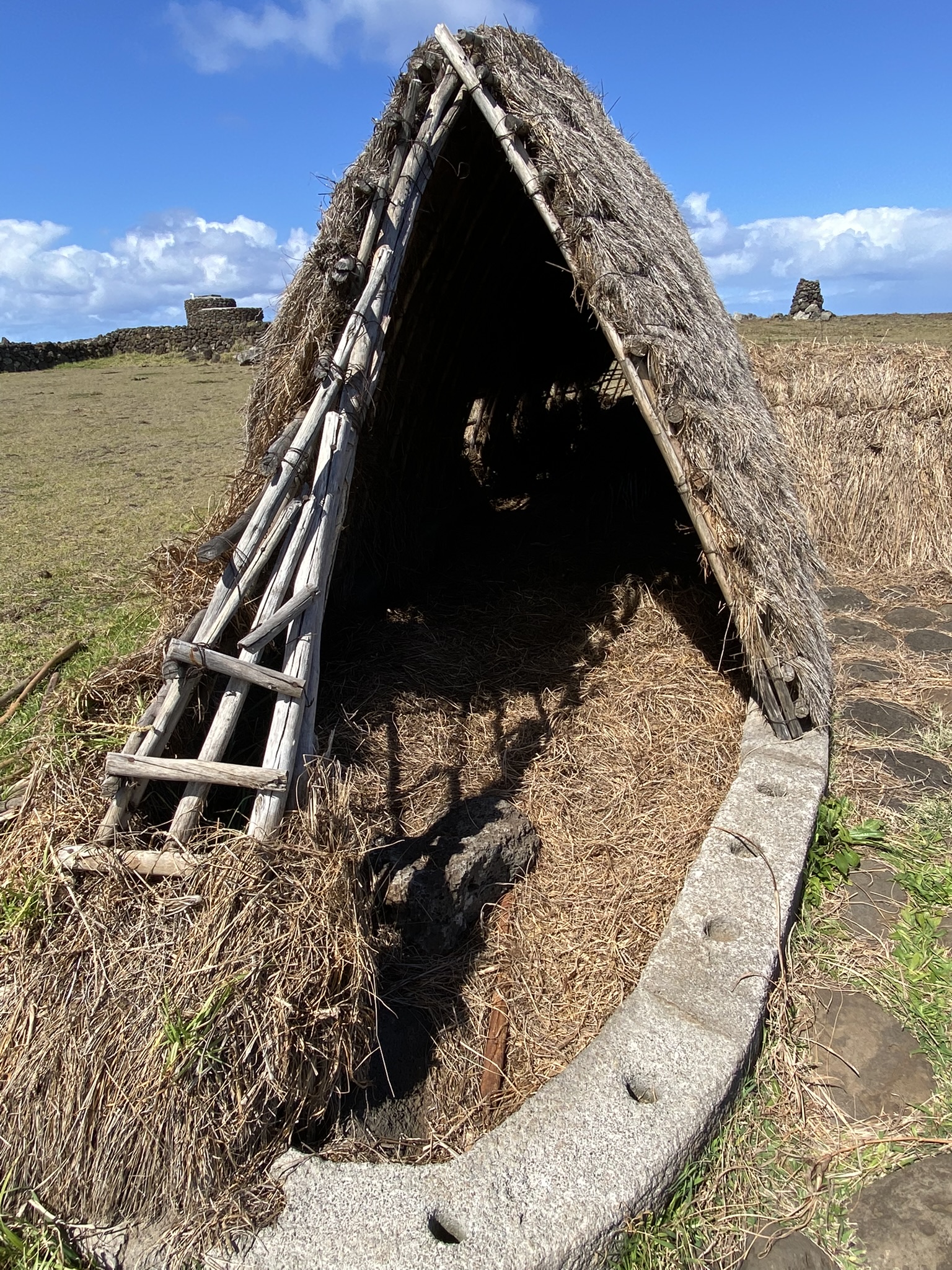 Orongo Village is located on top of a windy hill on the rim of the Rano Kau volcano. Over 50 homes made of layers of flat stones line the hillside with small entrances that one would have to crawl through to access the home. They were all connected inside. Here the ancient Birdman competition was held. This contest would pit representatives from each village on the island against each other in a dangerous climbing and swimming match to one of the offshore islands. The goal- to collect the first bird egg of the season. The winning tribe would then be granted rulership over the entire island for the following year.