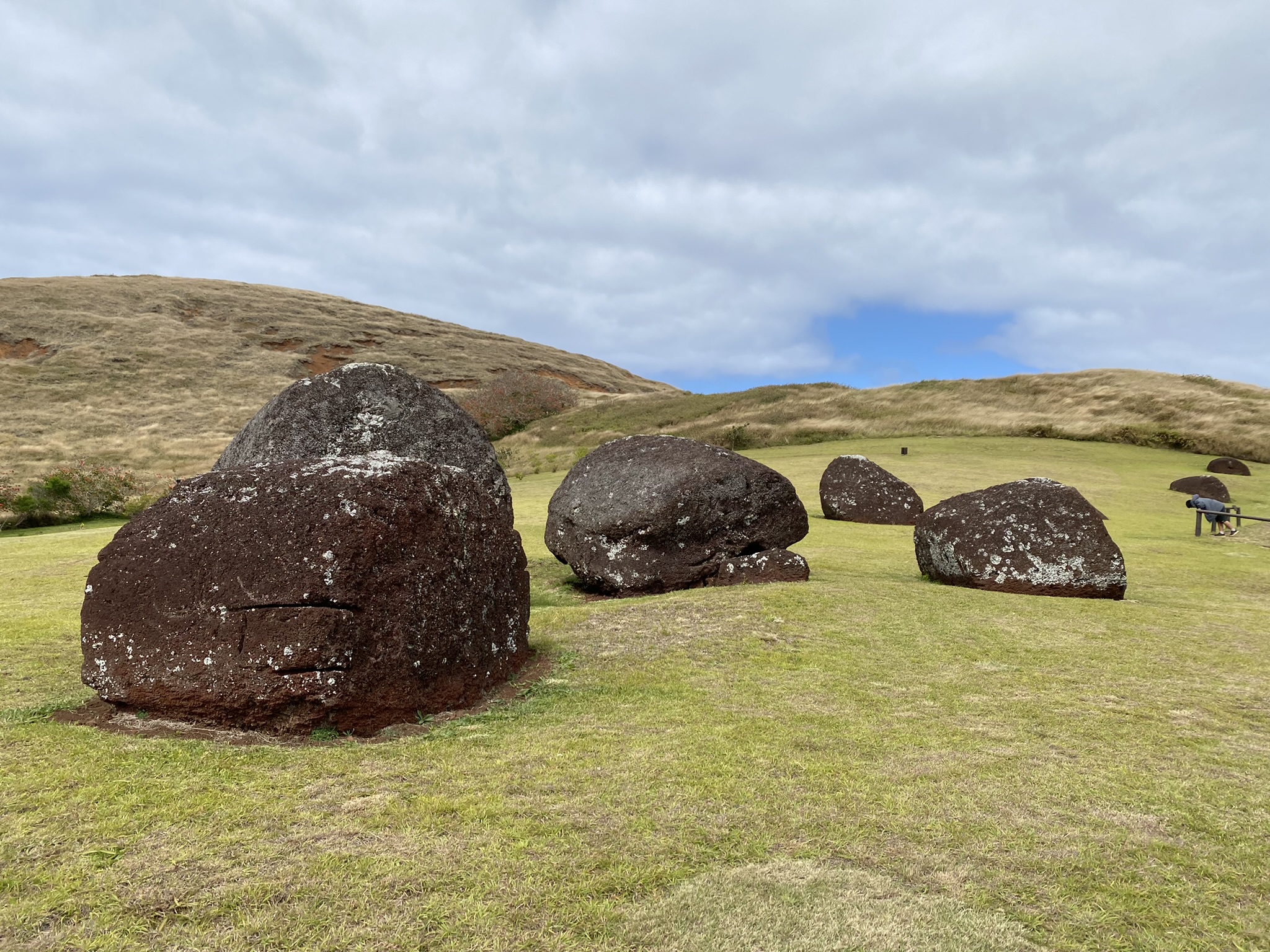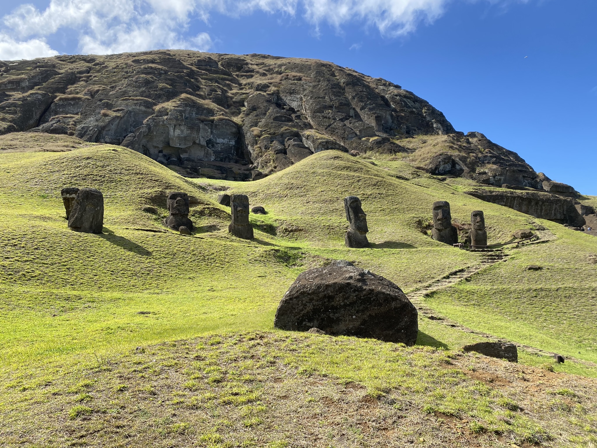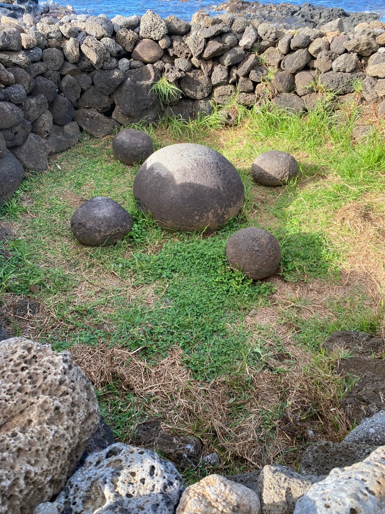 Puna Pau– the top knot quarry. Some of the moais found around the island have large red pieces of stone on their heads representing the hair or top knots of the people. We investigated the quarry and saw many pukaos that never made it to their destination.