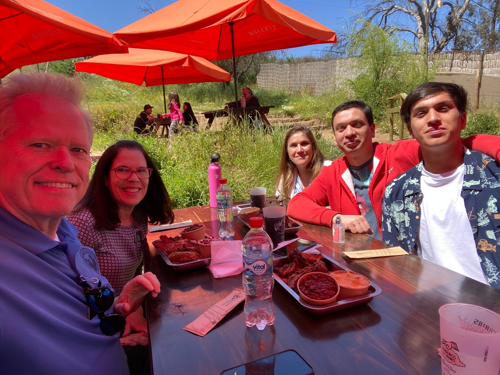 Monday was a holiday. At home, Columbus Day has been renamed Indigenous Peoples Day. In Chile, it is called Day of Discovery of Two Worlds or Day of the Races (commemorating the first encounters of Europeans with Native Americans and the diversity in their cultures.) For us, a holiday means a quiet day to catch up on our office work with no interruptions. We did take a mid-day break for almuerzo with the Ramirez family. They drove us an hour out of town to Curacavi for some authentic Texas barbeque.