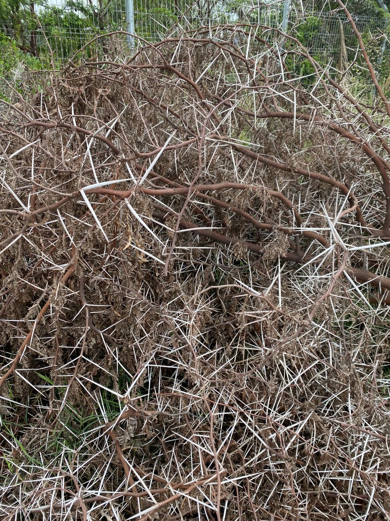 On a morning walk, we saw a plant used as nature’s barbed wire to place on top of fences to keep intruders out.