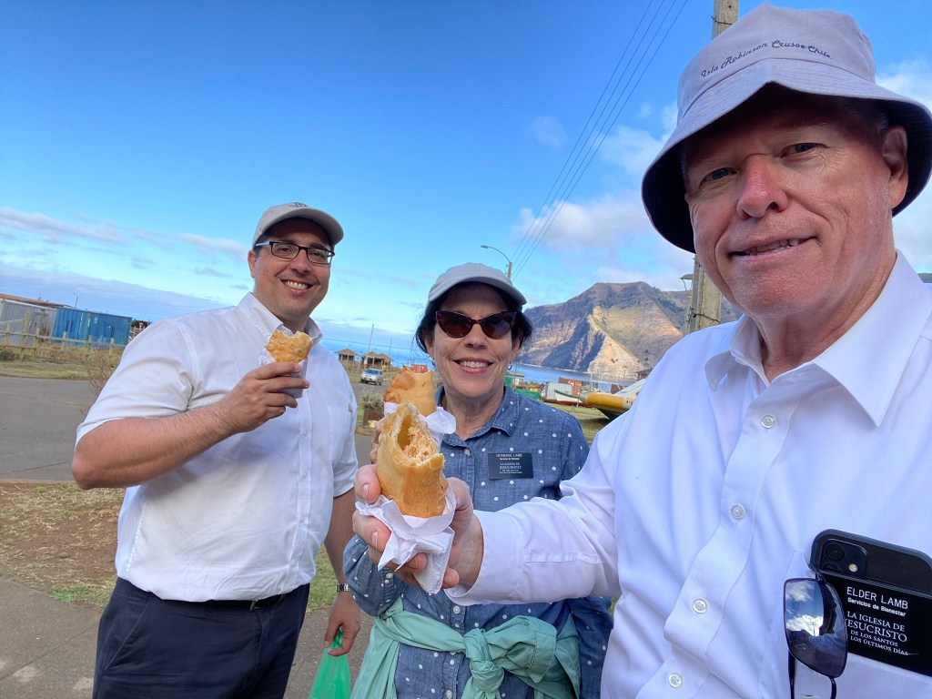 Our church has a deep connection to this island. Most Mormon pioneers crossed the American plains by wagon or handcart, but lacking means to travel overland some Saints answered the call to gather in the west by sailing from New York to what is today San Francisco on the ship Brooklyn. On February 4, 1846, the same day Nauvoo Saints started to cross the Mississippi River to head west, 238 men, women, and children sailed out of New York harbor to sail around South America’s Cape Horn. When the dreaded Cape Horn was skirted without incident, passengers thought their journey’s woes were over and the ship headed for Valparaiso, Chile to replenish supplies. Their drinking water had become so thick and slimy it had to be strained between their teeth. Rats abounded in the vessel and cockroaches and smaller vermin infested the provisions. But before they reached Chile, a storm hit and drove them back almost to the Cape. The skilled captain headed instead for the Juan Fernández Islands. Ashore, the passengers bathed did laundry, obtained fresh fruit and potatoes, caught and salted fish put 18,000 gallons of freshwater into the ship’s casks, and stocked up on firewood. If they would have gone to Valparaiso, it would have cost them hundreds of dollars. Residents of Robinson Crusoe Island are remembered with fondness by members of our church for the kindness and hospitality they showed to our people. When residents saw our missionary name tag, they stopped us to tell us their version of the story which has been passed down through generations. Leopoldo Gonzalez Charpentier introduced himself and told us his ancestors were on the island at the time the shop Brooklyn landed. These islanders are just as warm and generous now as they were almost 200 years ago. We are very grateful for the opportunity we had to visit this very special place.