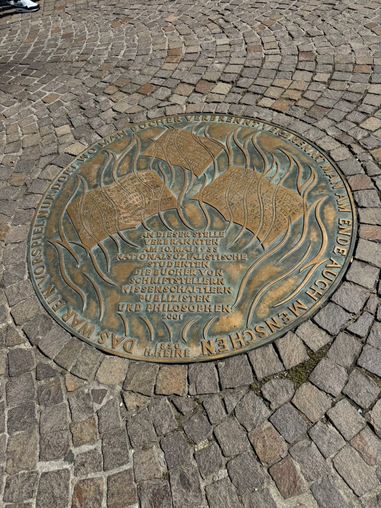 On the ground in the square is a memorial plaque that reads: ‘At this place on May 10, 1933, National Socialist students burnt books by authors, scientists, and publicists.’ These Nazi sympathizers burned more than 25,000 books. The somber plaque includes words from Heinrich Heine stating, ‘That was just the beginning. Where one burns books, in the end, people are burnt as well.’