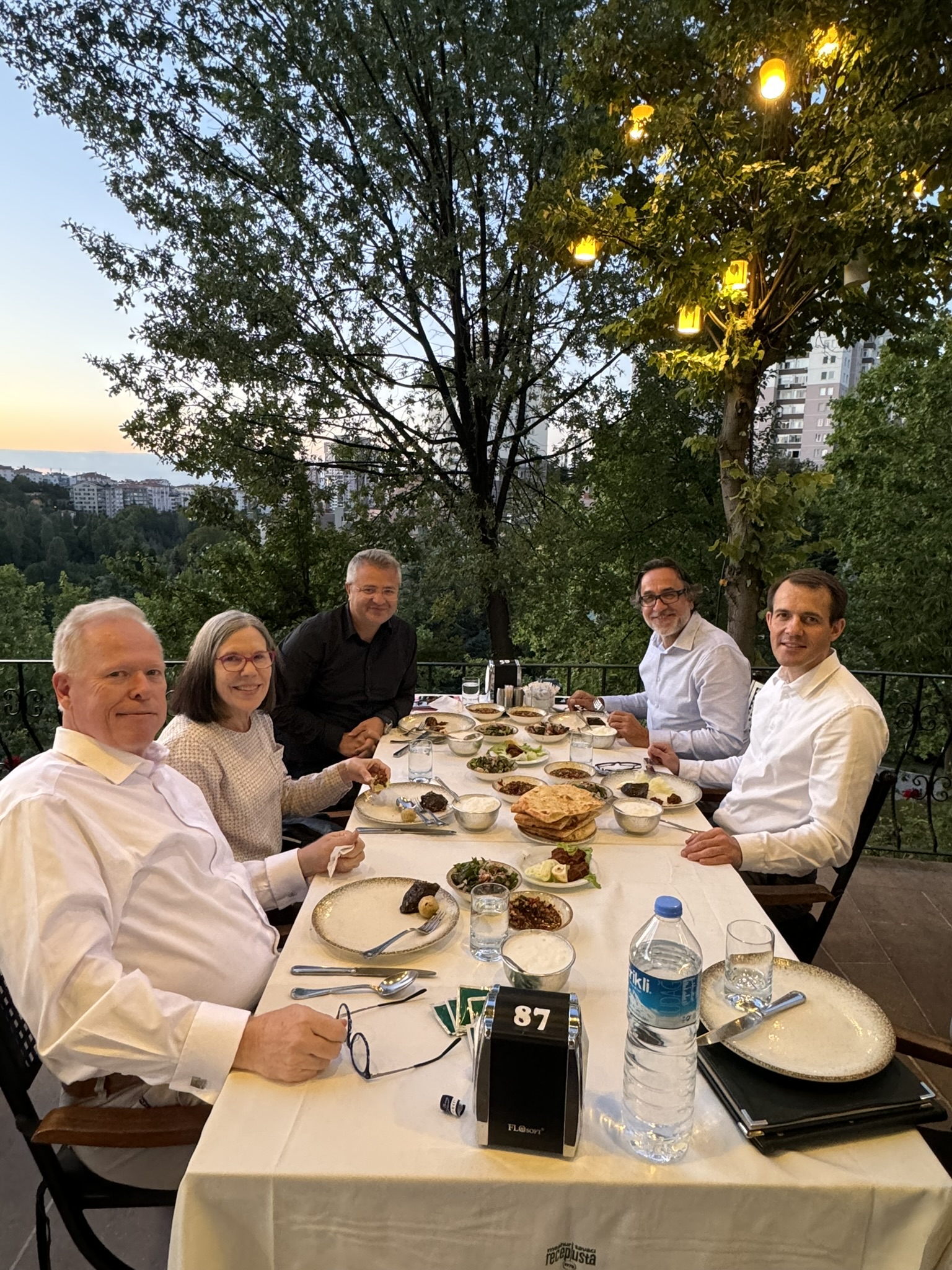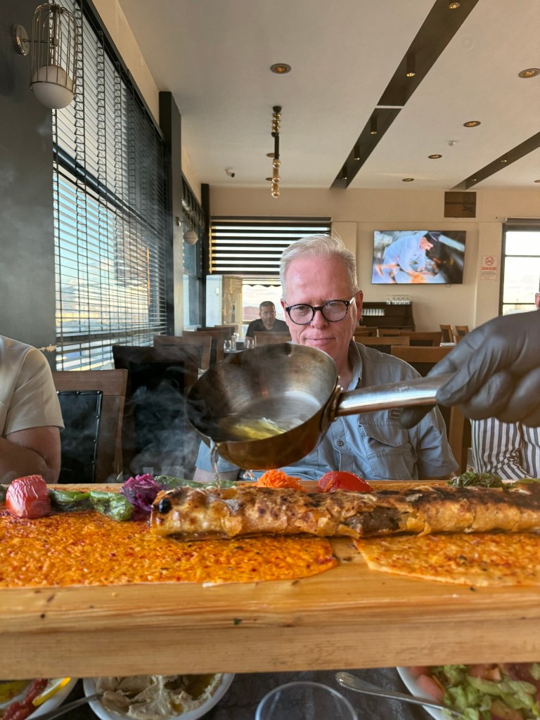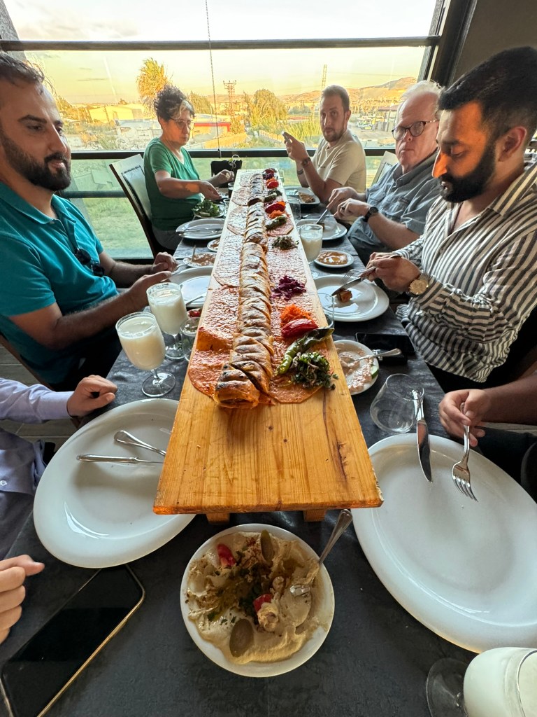 We ended the day with a delicious meal overlooking the city of Ankara. The main dish was lamb served with bulgar wheat with delicious sides. Dessert was called irmikhelvas (sweet semolina) and ice cream. The mandarins in Türkiye have green peel.
