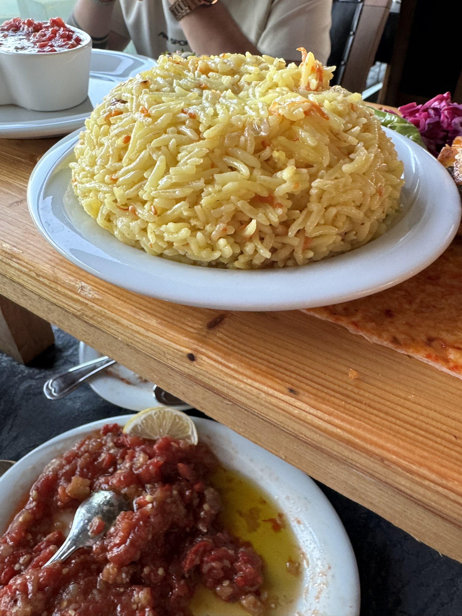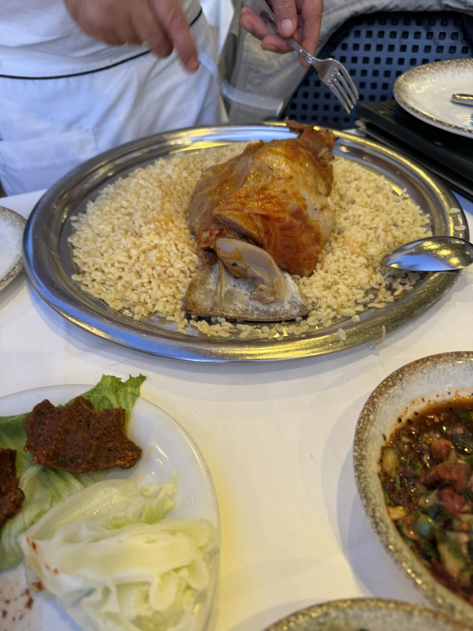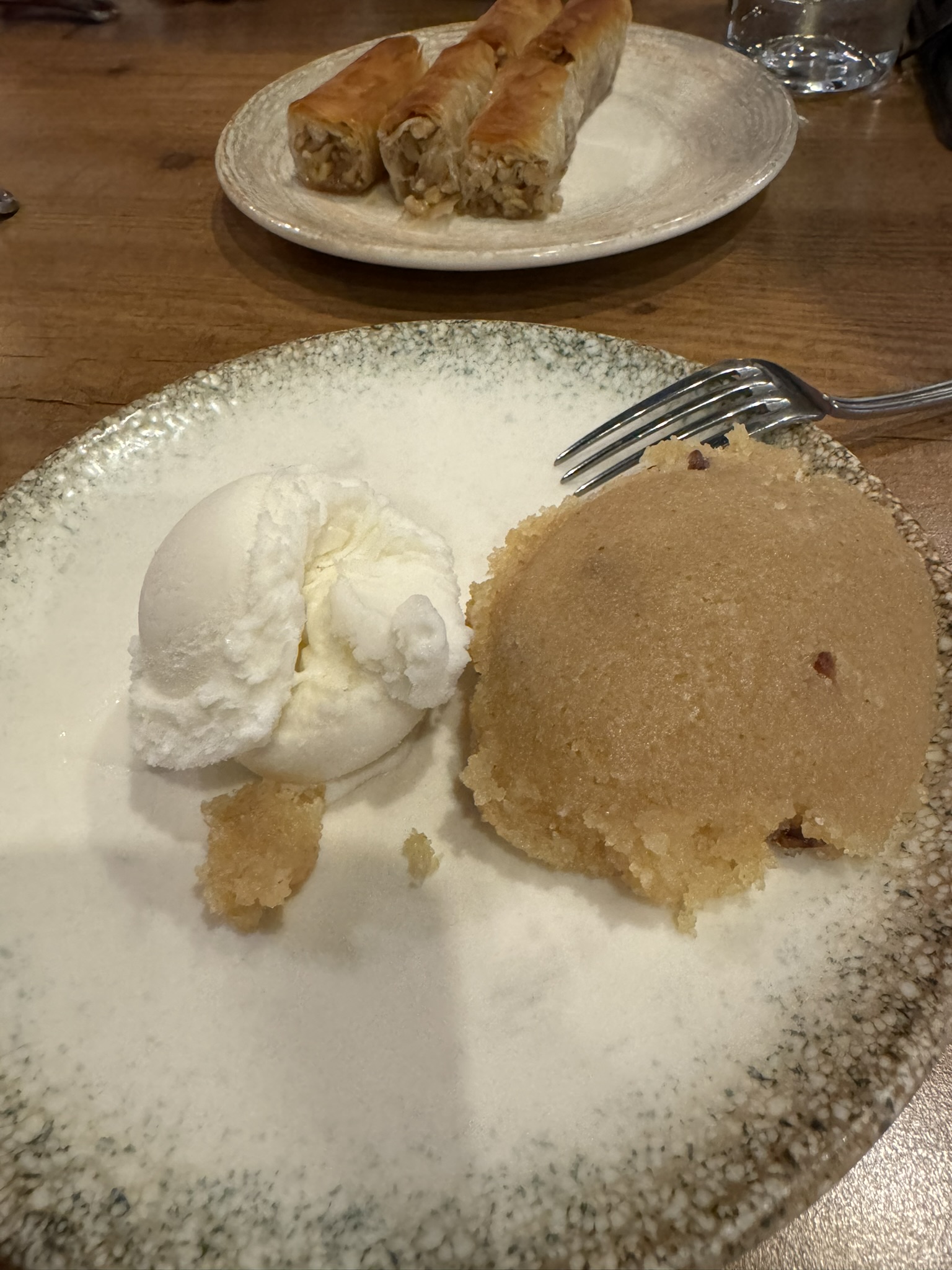 We ended the day with a delicious meal overlooking the city of Ankara. The main dish was lamb served with bulgar wheat with delicious sides. Dessert was called irmikhelvas (sweet semolina) and ice cream. The mandarins in Türkiye have green peel.