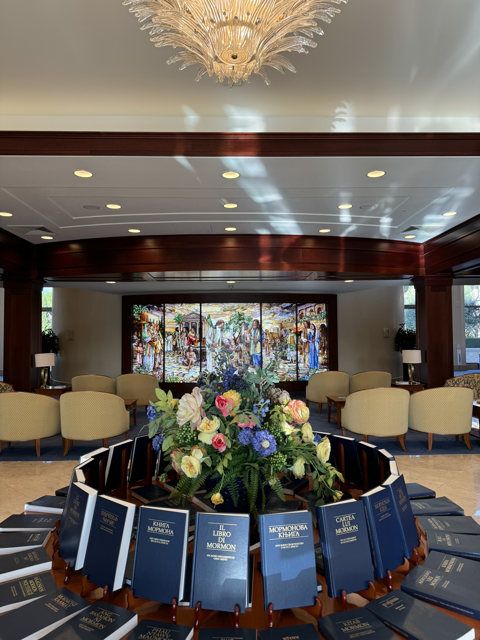 Looking out of the back of the visitor’s center is the magnificent Rome temple- what a masterpiece. The oval shape is found throughout the Rome temple. An oval has no beginning and no end and is a symbol of eternity. Patterns that were inspired by Michelangelo’s Piazza del Campidoglio located on top of Capitoline Hill include the artist’s intriguing oval design. The baptismal font is an oval, as are the rugs, ceiling motifs, and floor mosaics.