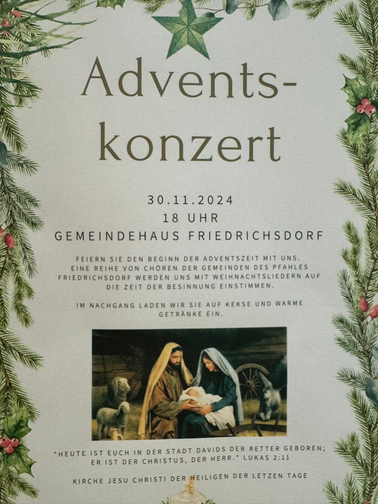 December 1st, First Advent Sunday, marks the beginning of the Advent season, a time of preparation for the celebration of Christ’s birth at Christmas and the return of Christ at the Second Coming. The theme for the first week of advent is hope. We joined with our ward choir to sing in an Advent Concert on Saturday night. Choirs from different wards in our stake sang. We have very diverse congregations. We heard music in German, French, English, Portuguese, and Spanish. We are not sure how much help we provided as we struggled to pronounce the German words, but we enjoyed the spirit of raising our voices in praise to our Savior. The German people sing with gusto. It is a joy to be among them.
