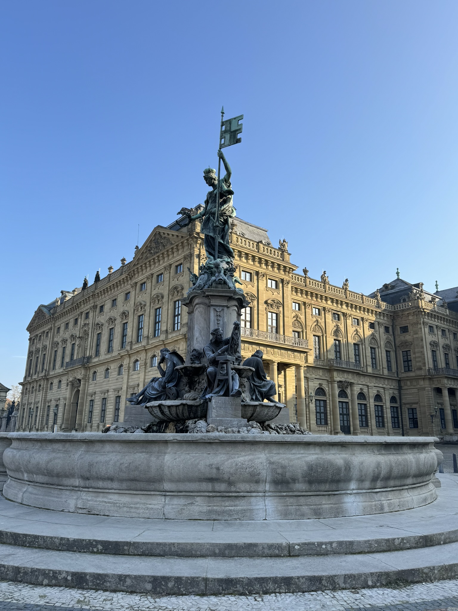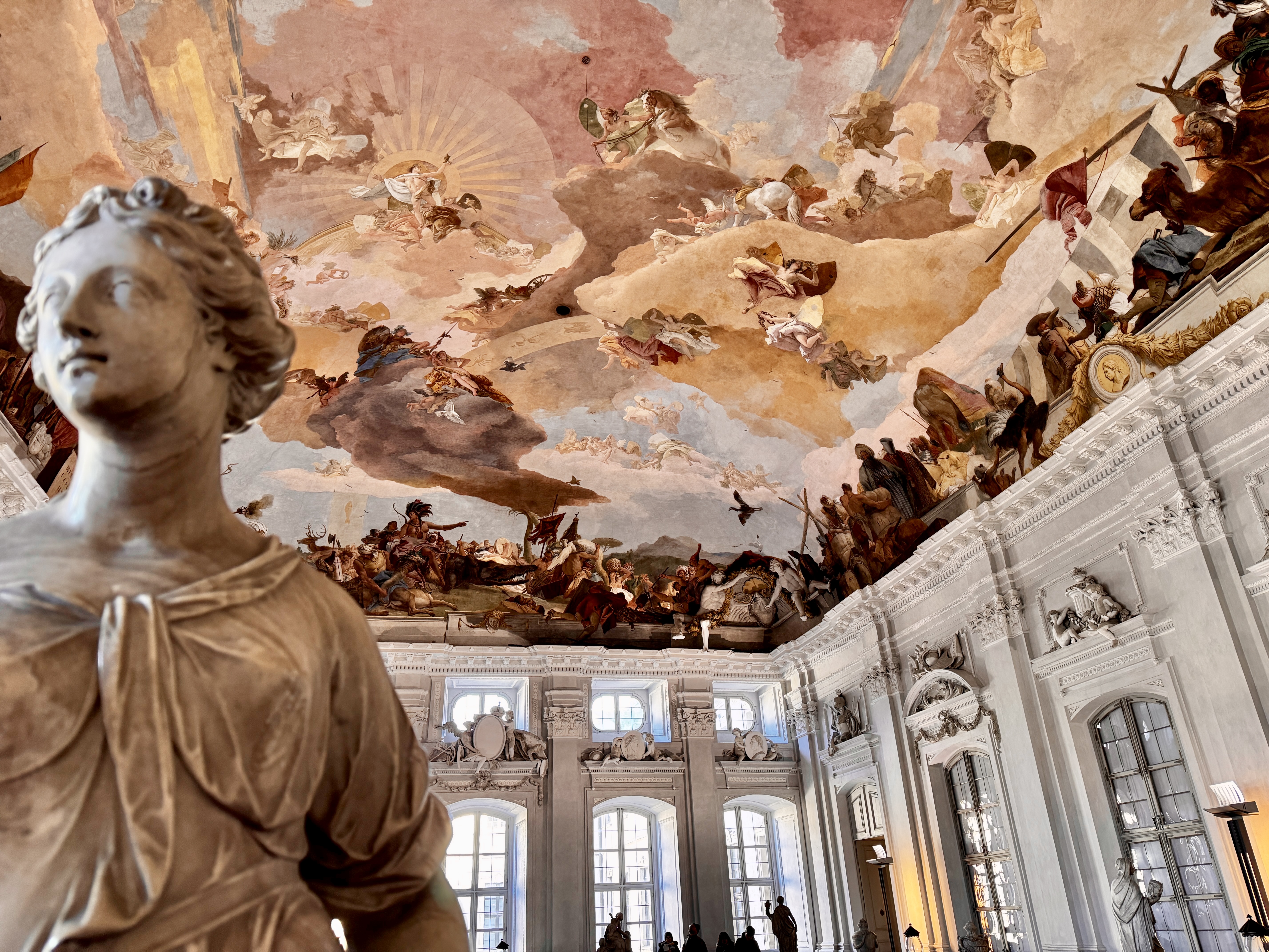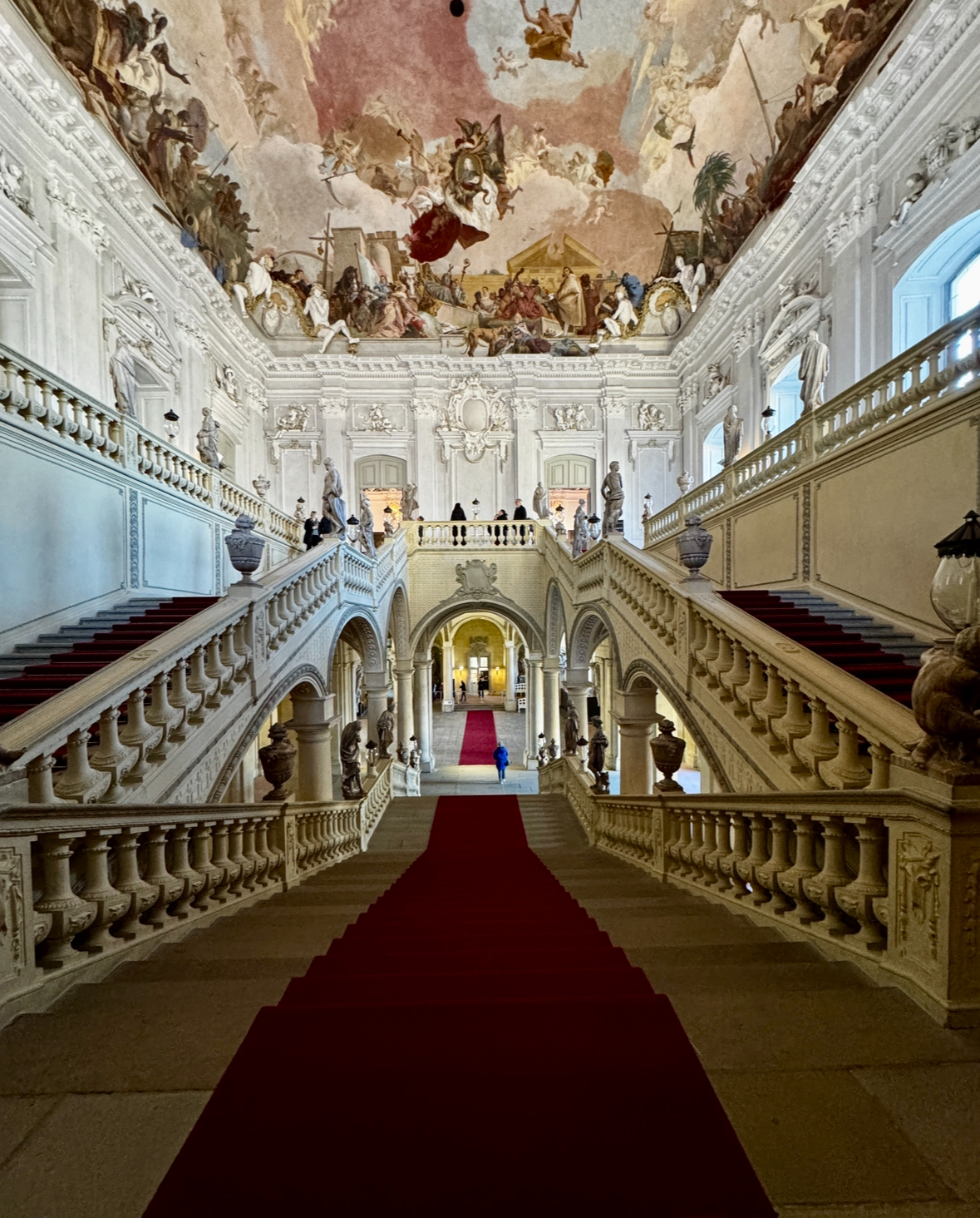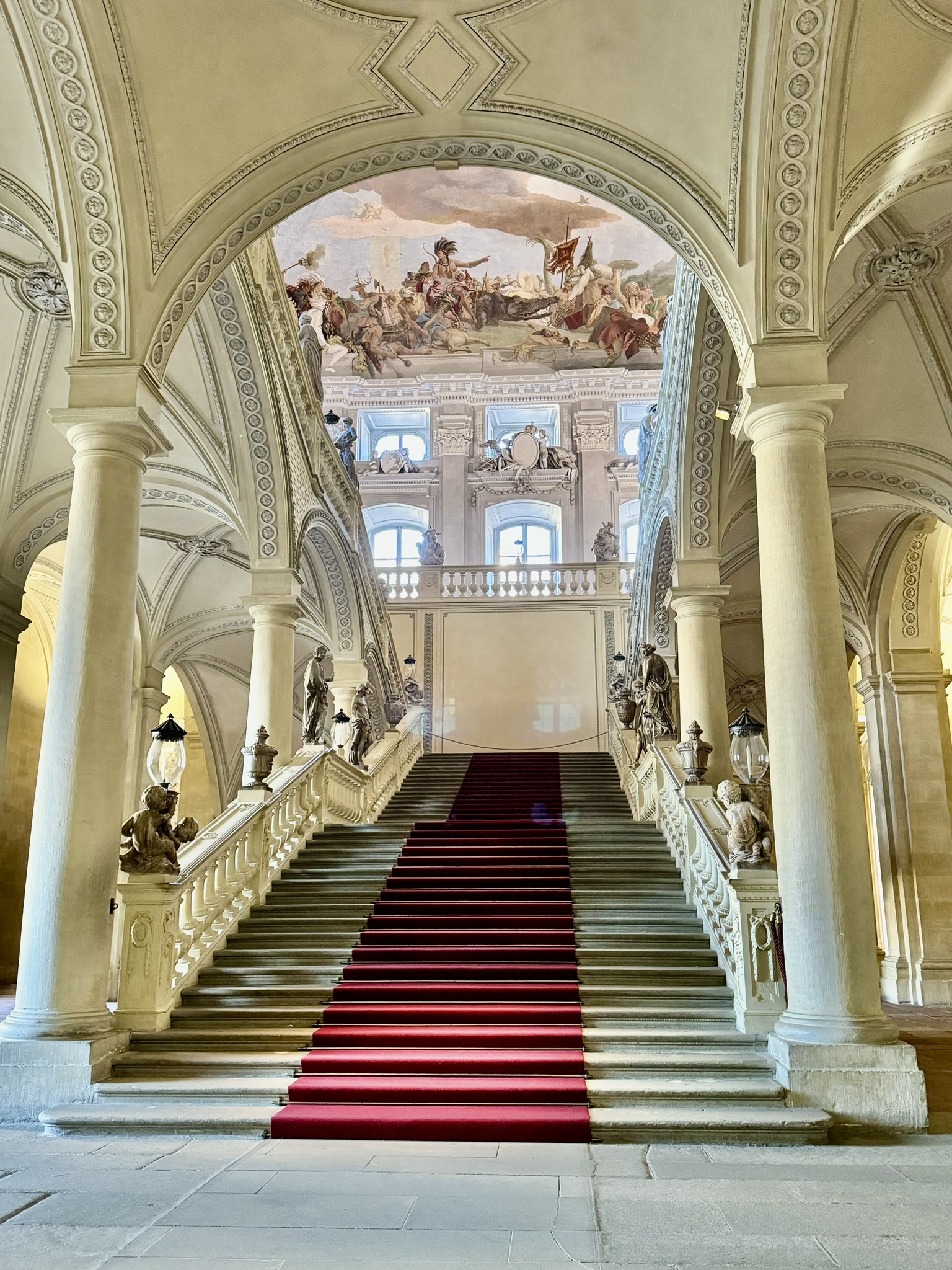 Neumann’s world-famous staircase, roofed by an unsupported vault, contains a ceiling fresco representing four continents. This center part of the palace survived the March 1945 bombings that destroyed both wings.