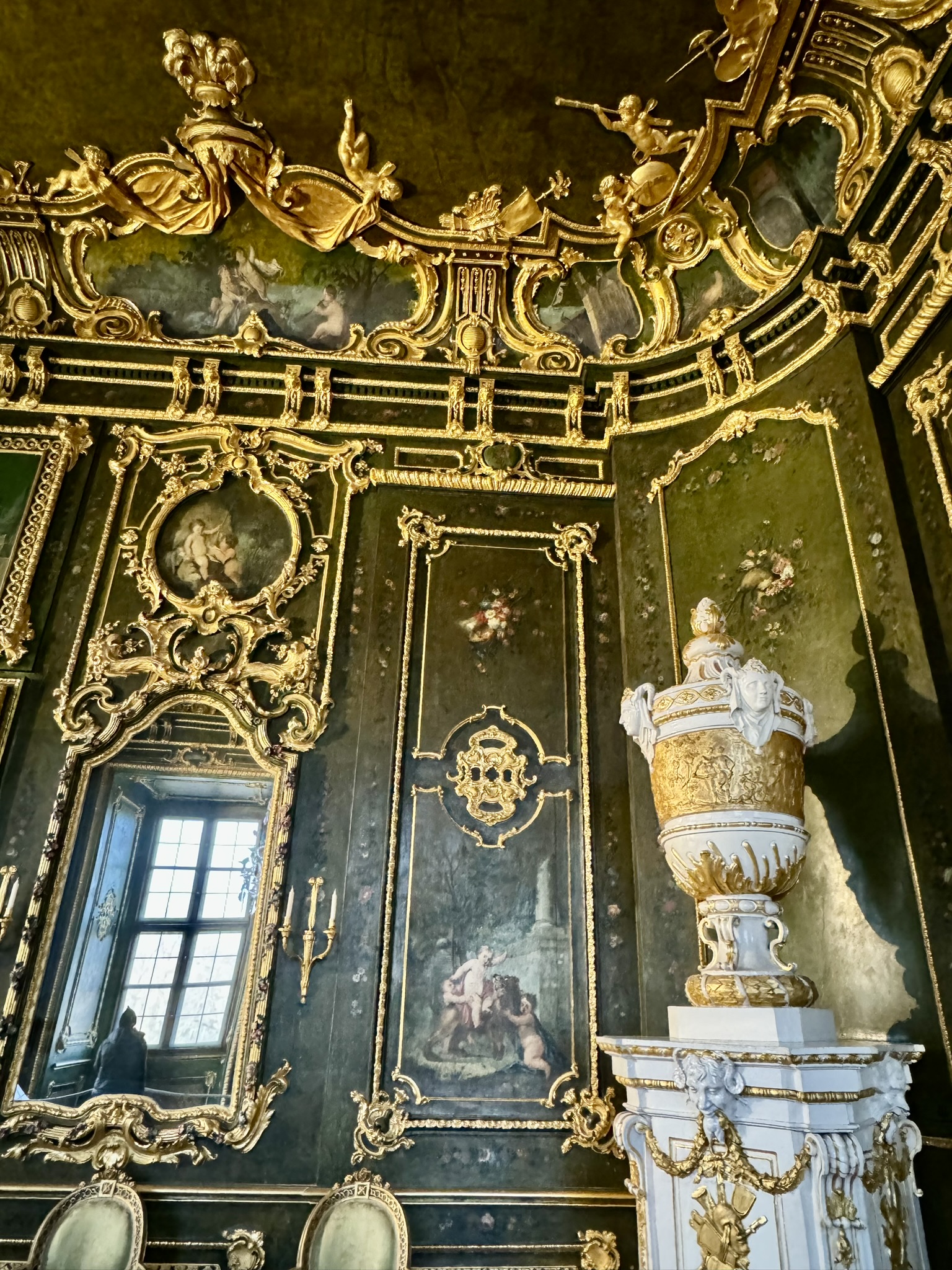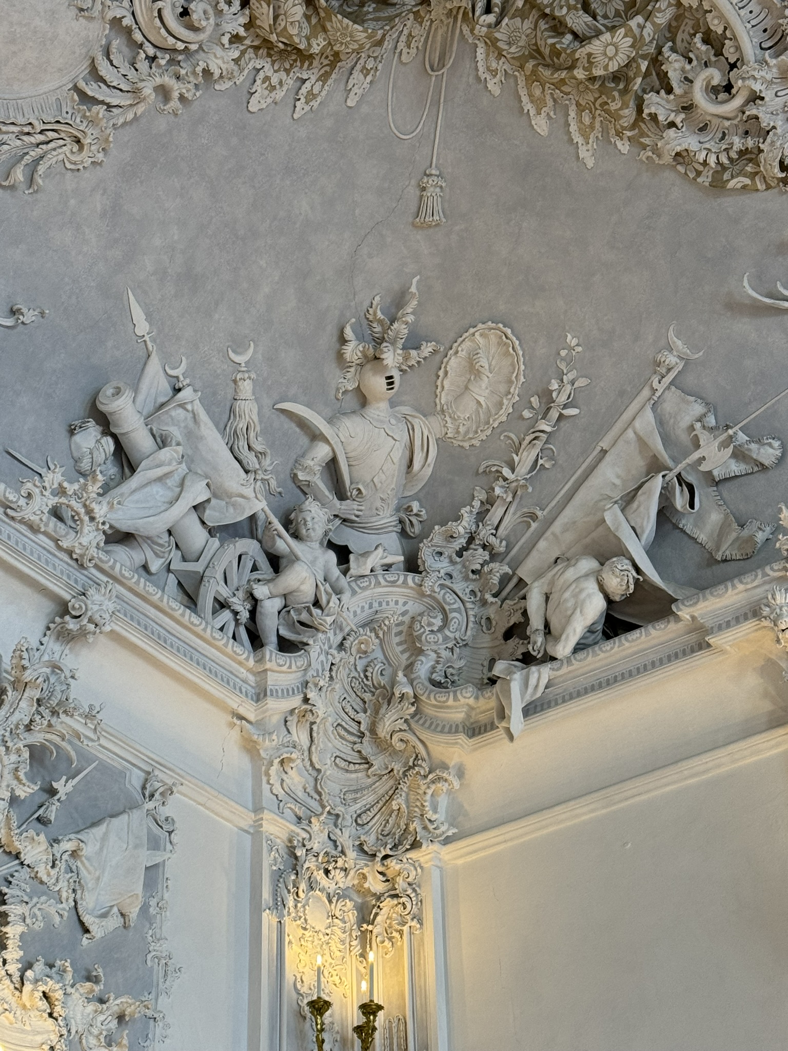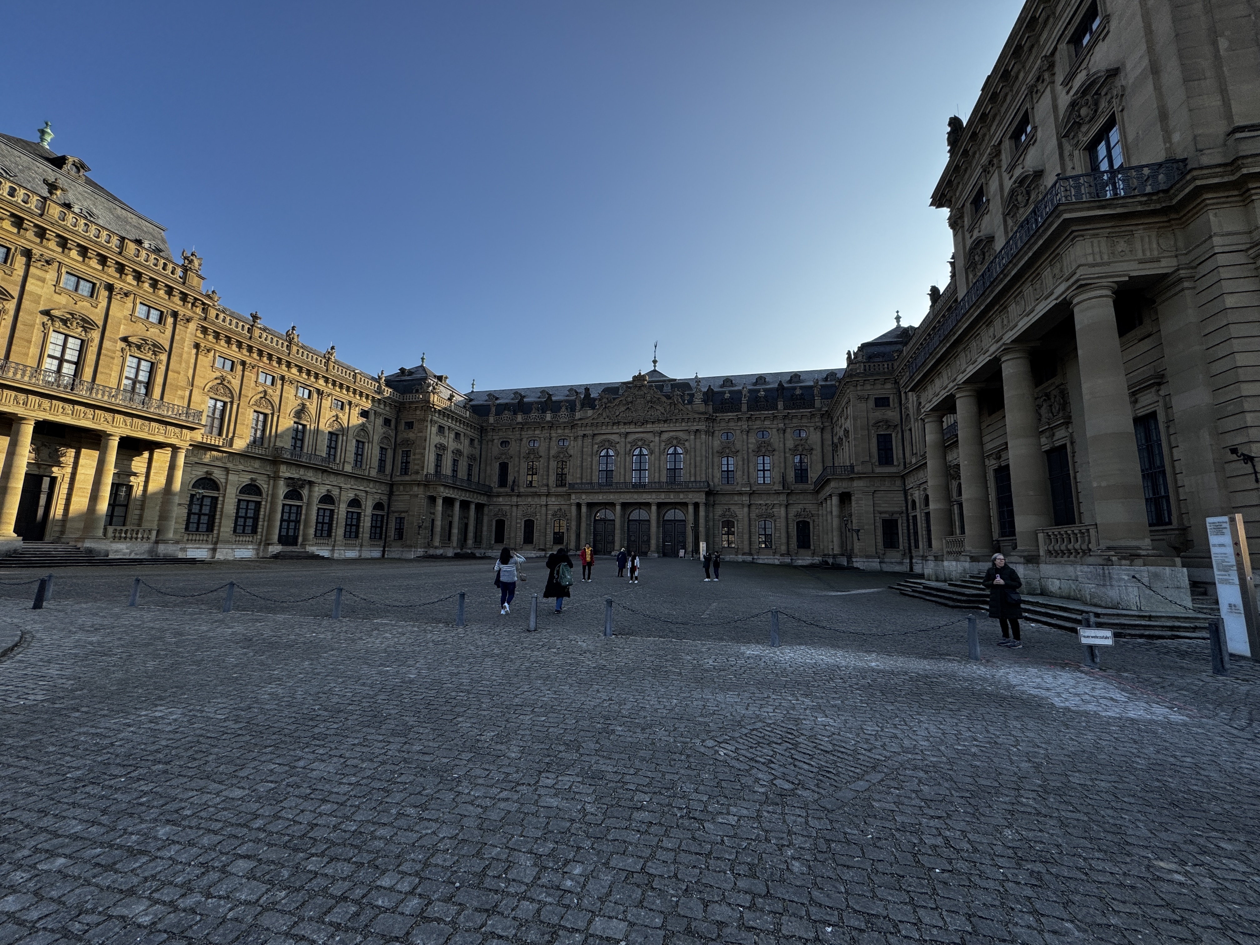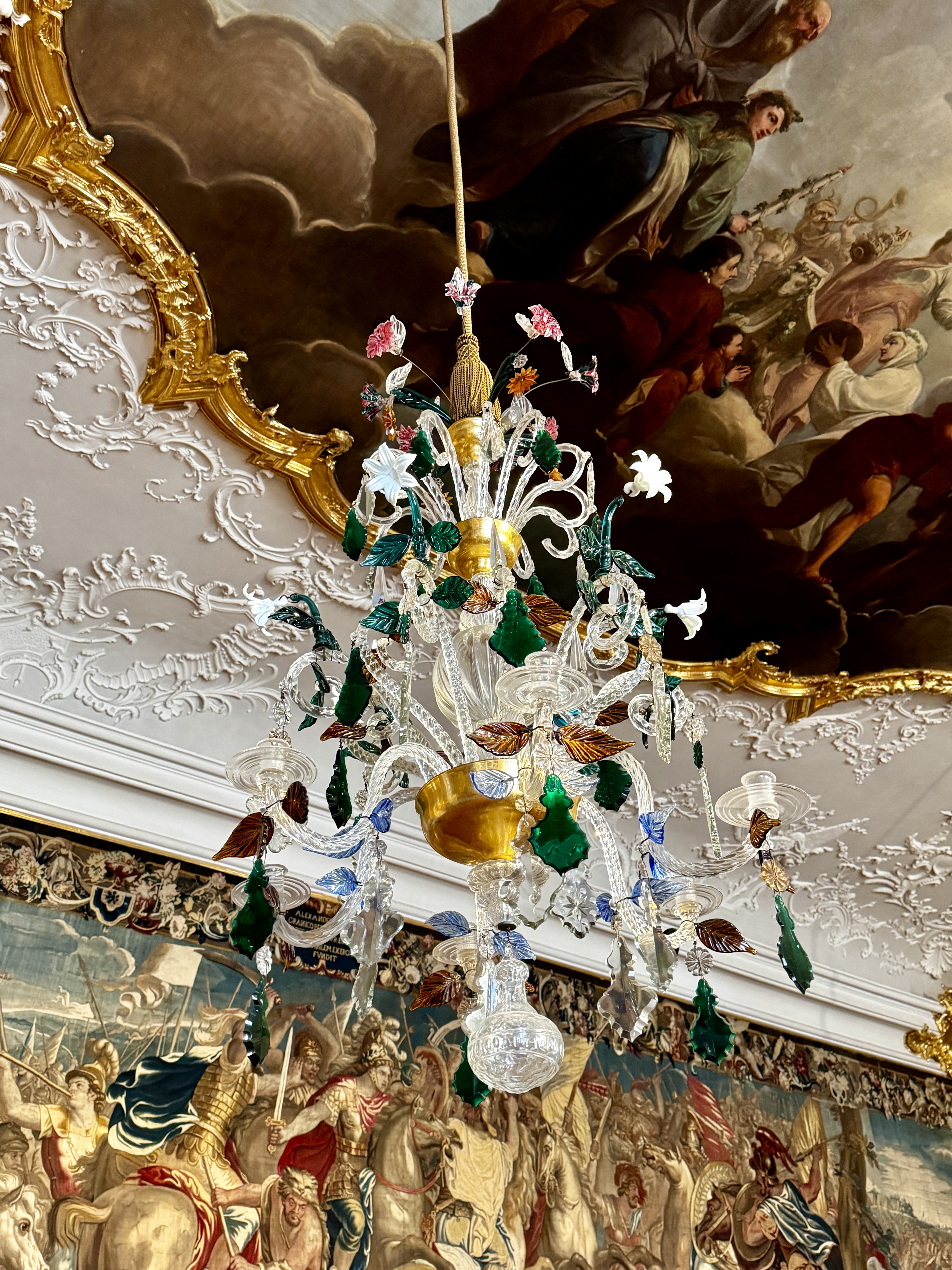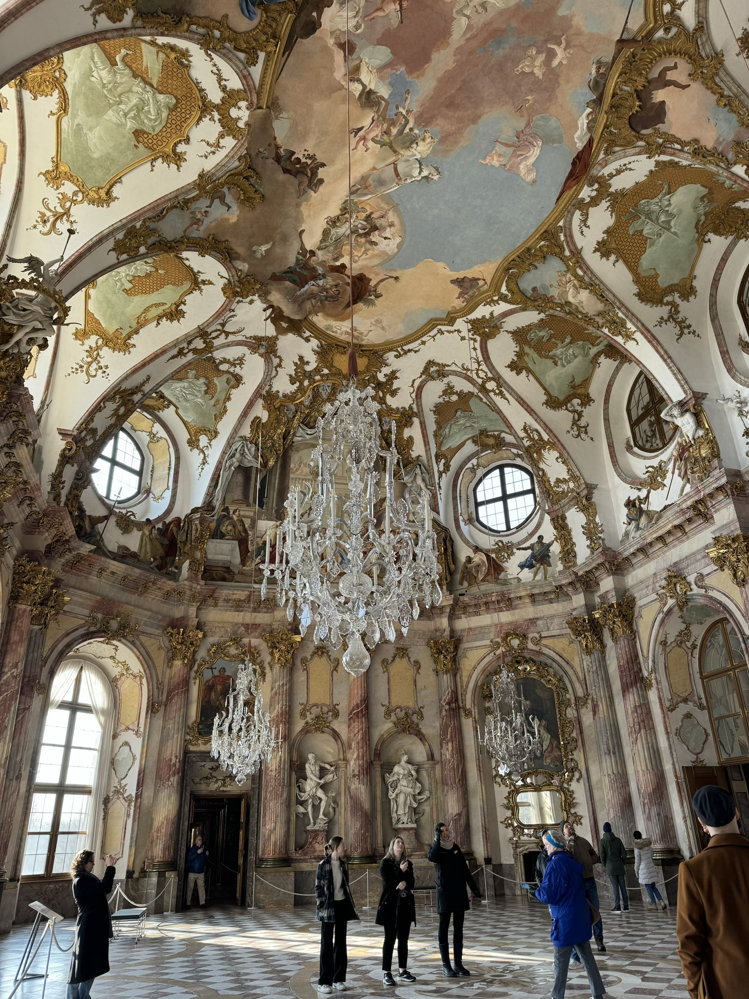 Neumann’s world-famous staircase, roofed by an unsupported vault, contains a ceiling fresco representing four continents. This center part of the palace survived the March 1945 bombings that destroyed both wings.