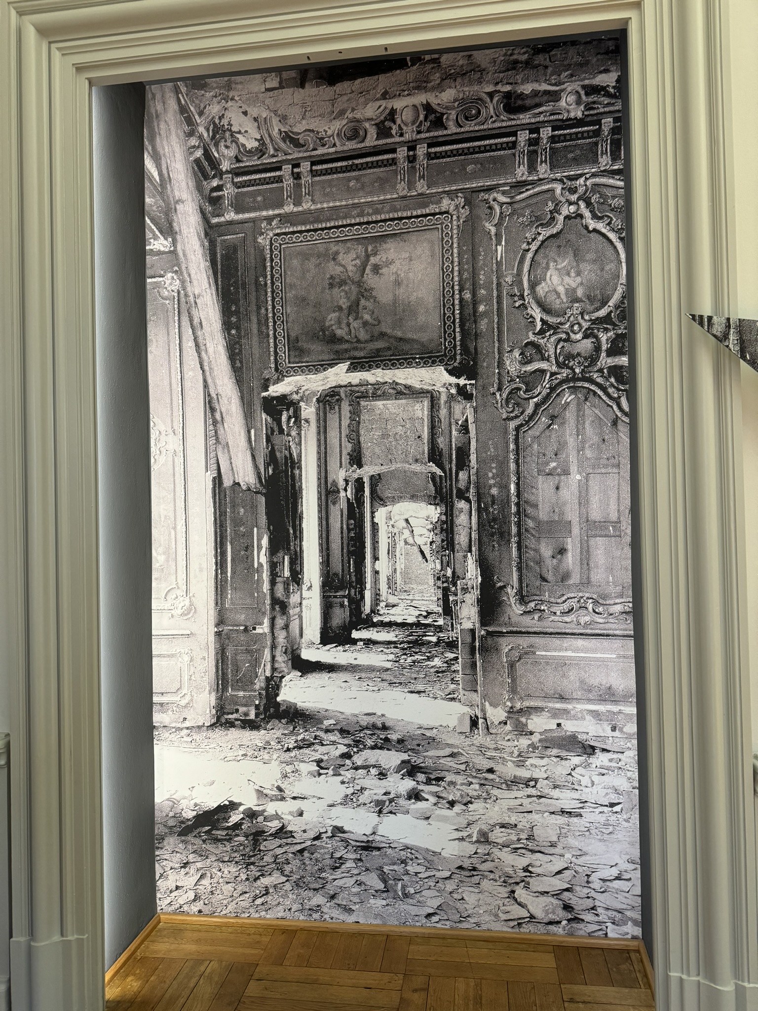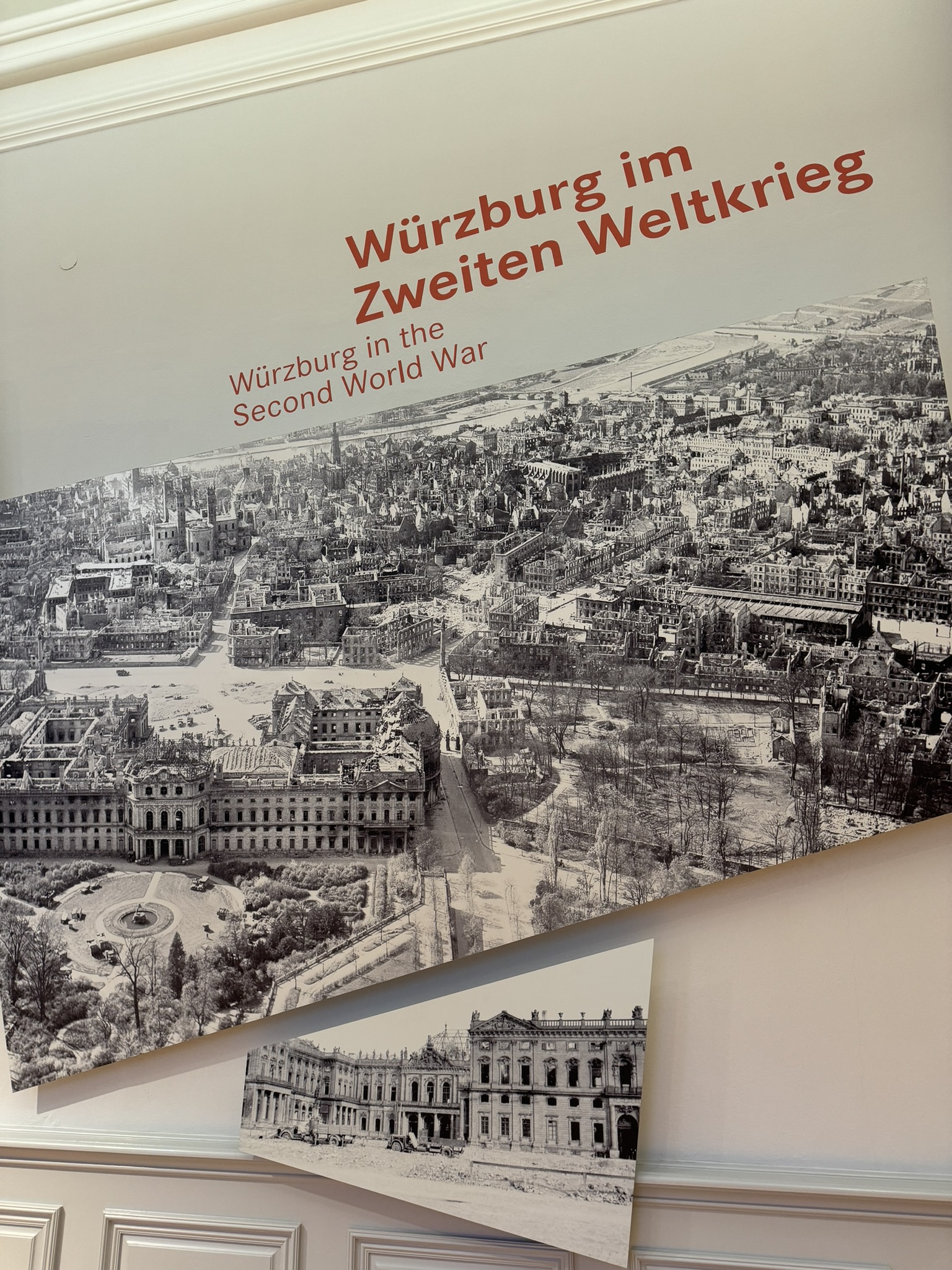 Furniture and furnishings had been removed before the bombing. Art historian, John D Skilton was stationed in Wurzburg from June- October 1945 as an American Second Lieutenant and Officer of the Monuments and Fine Arts Section. In an exemplary manner, he organized initial rescue a restructuring measures for the cultural heritage for the destroyed city. FYI- Lieutenant Skilton did not appear as a character in the Monuments Men movie.