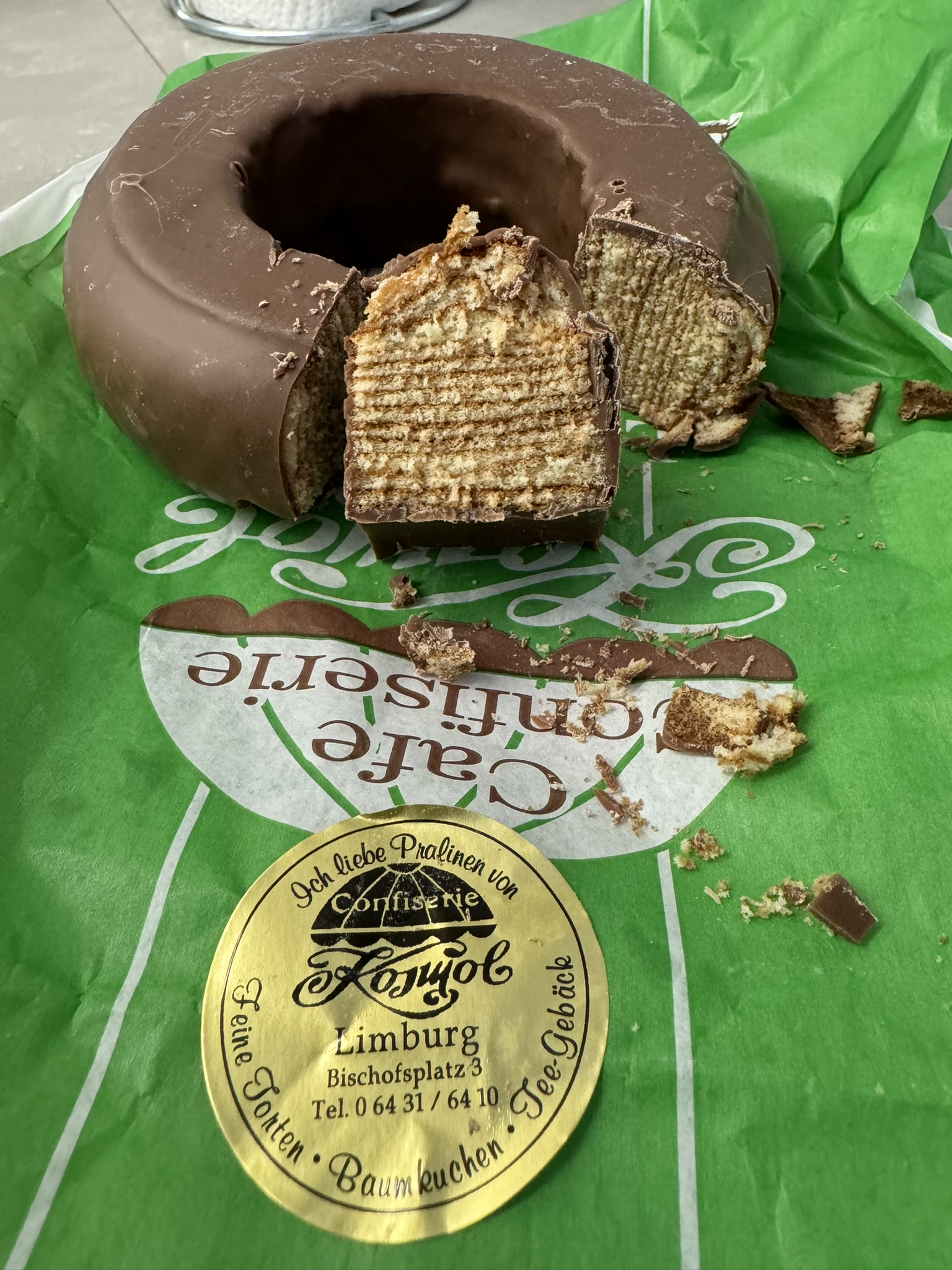 The wonderful smell drew us into bakeries. Schichttorte is a traditional German dessert. Named ‘tree cake’ because the many layers of cake look like a trees inner growth rings. This one was baked in a doughnut shape.