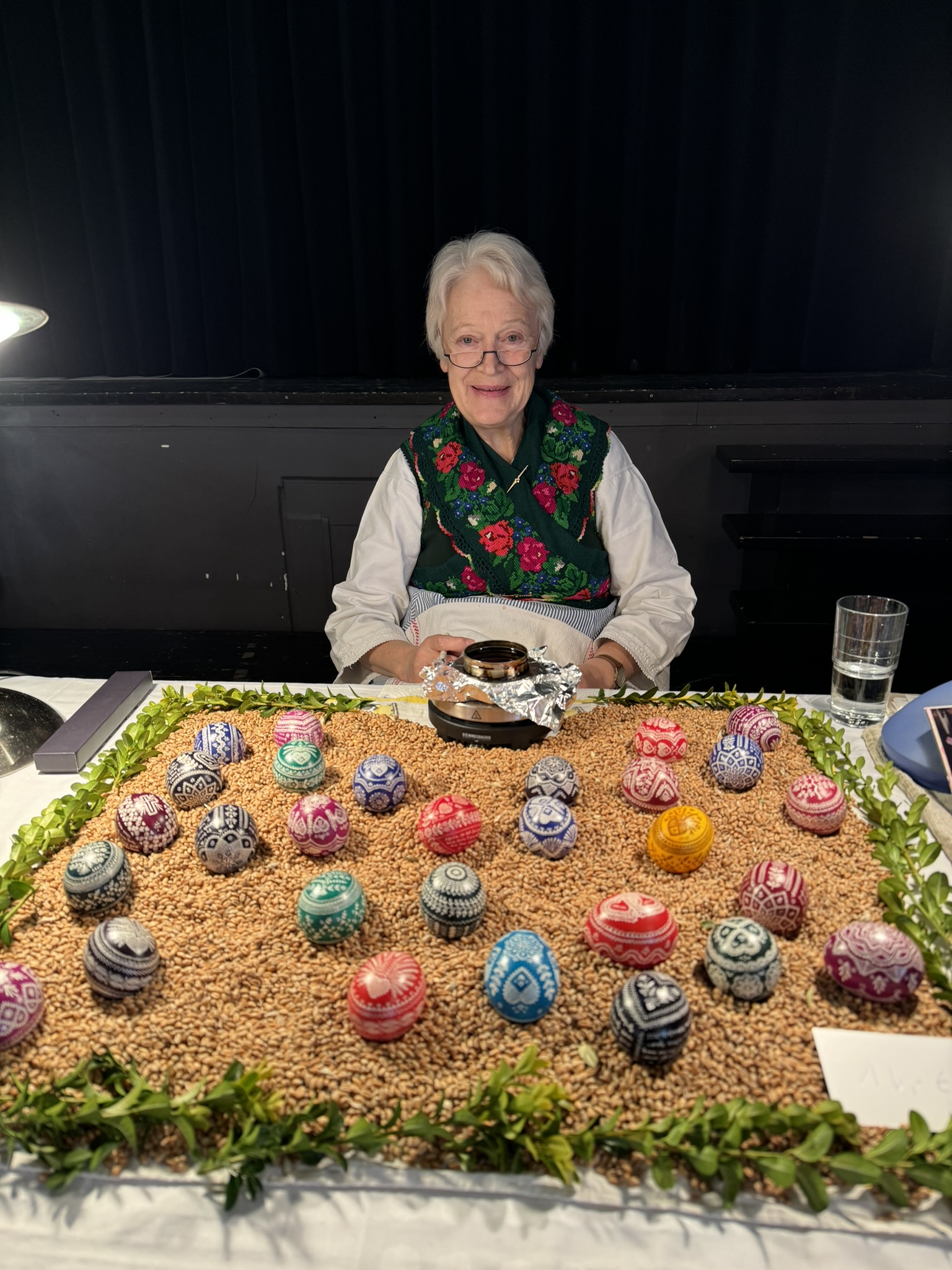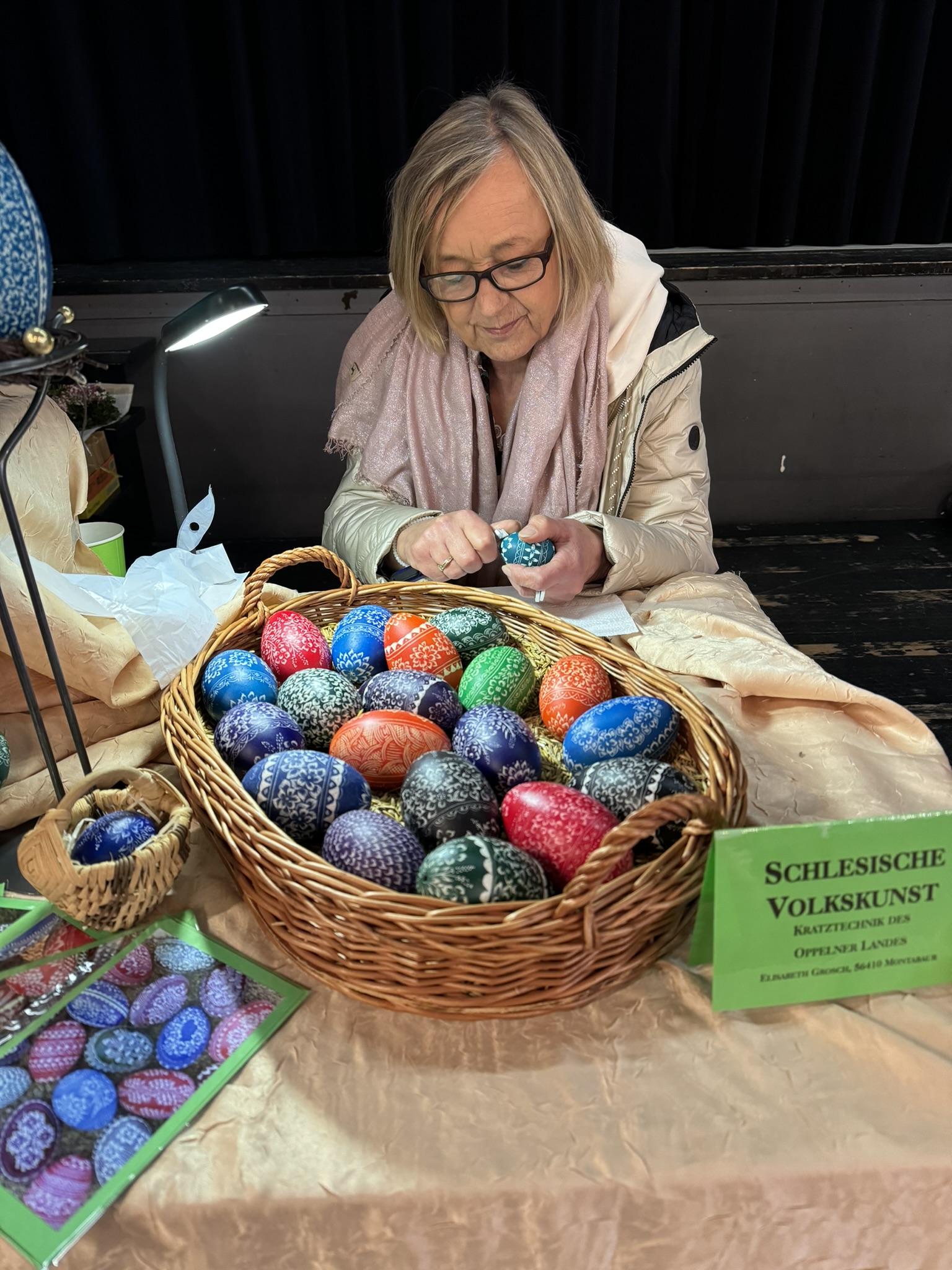 We visited the Easter market in Braunfels and watched two different artists creating beautiful Easter eggs. One woman was hand painting eggs with beeswax. The other eggs were dipped in color, and she was using a tiny tool to scrape off the color to create a design.