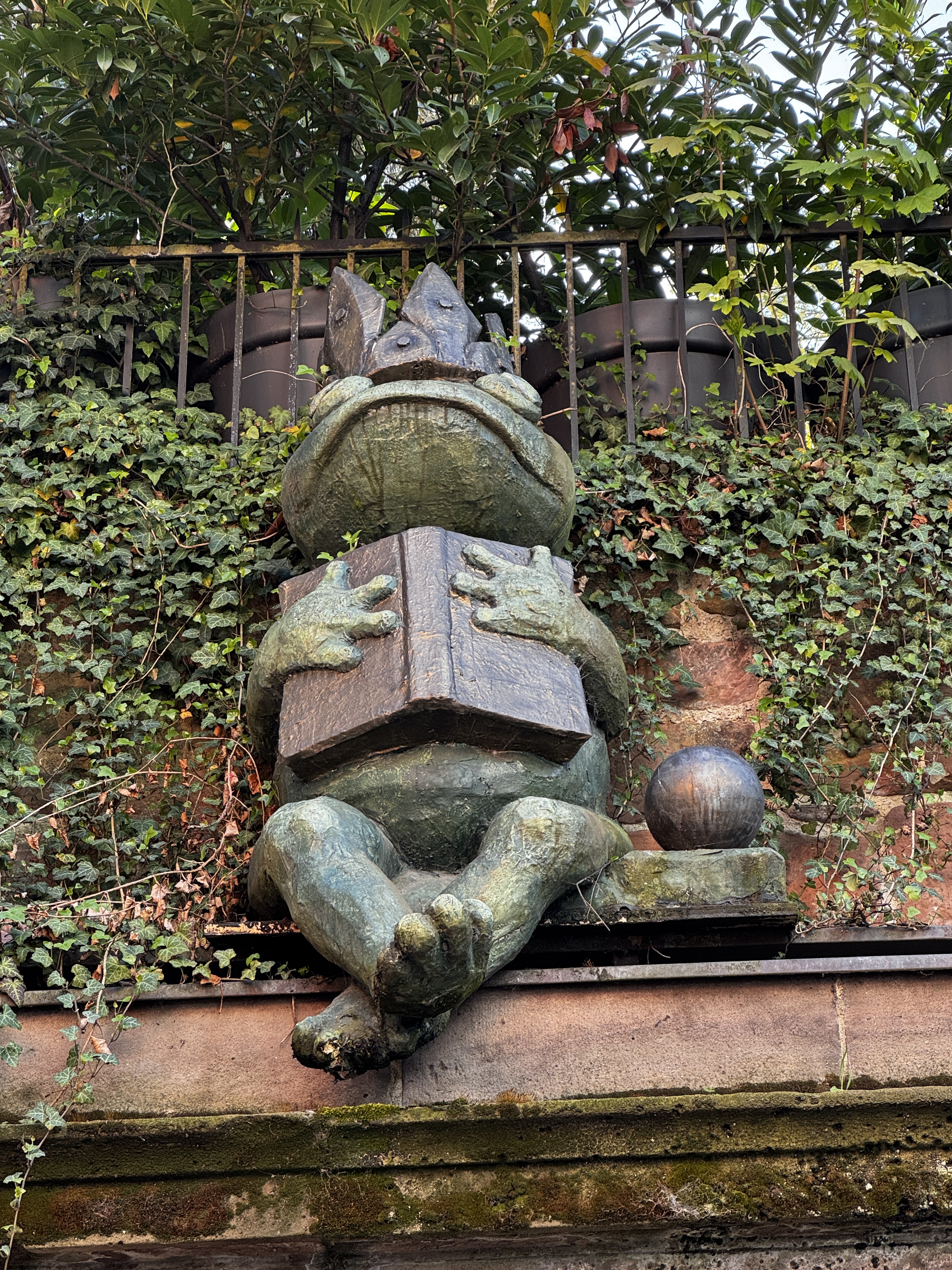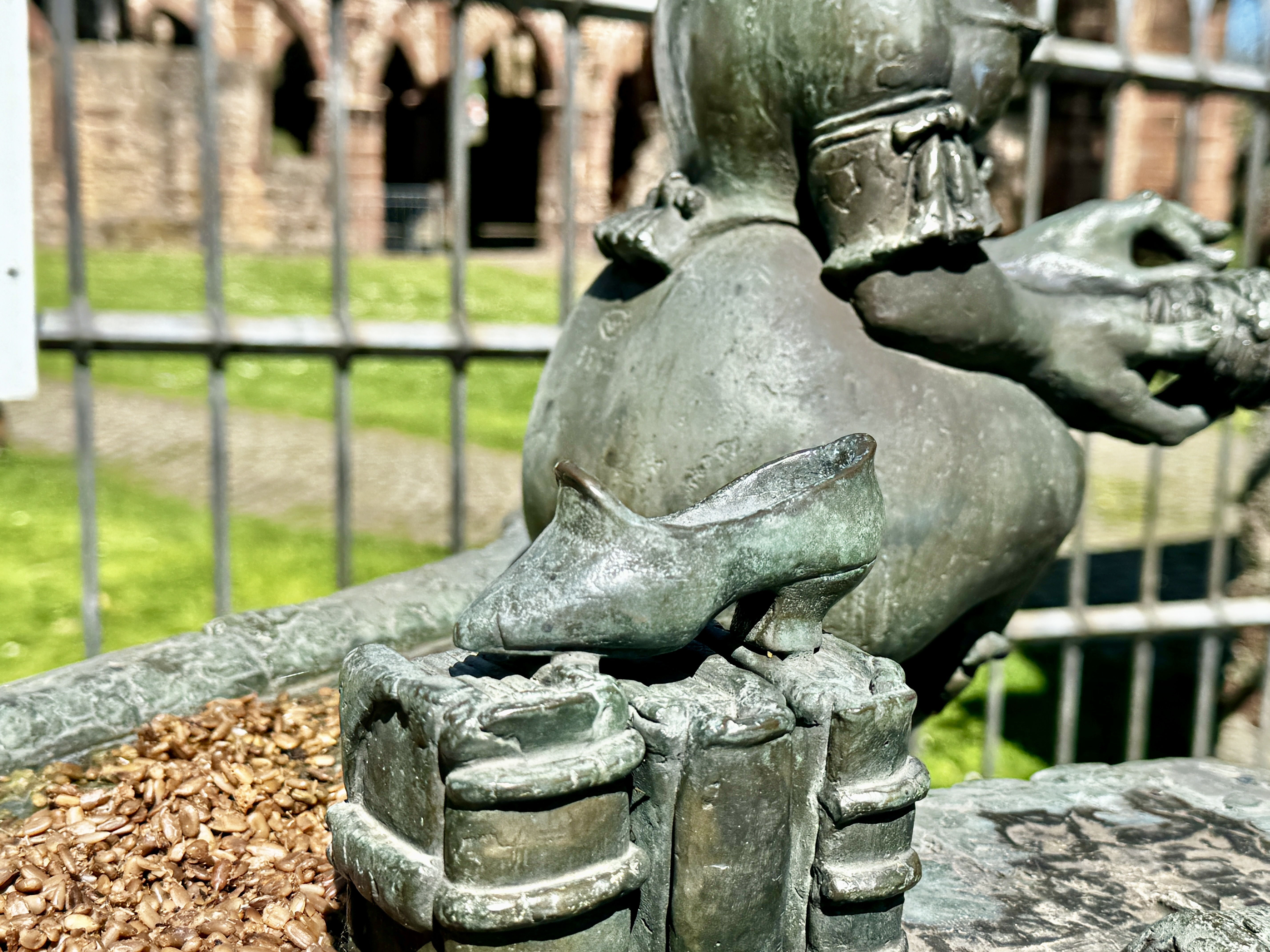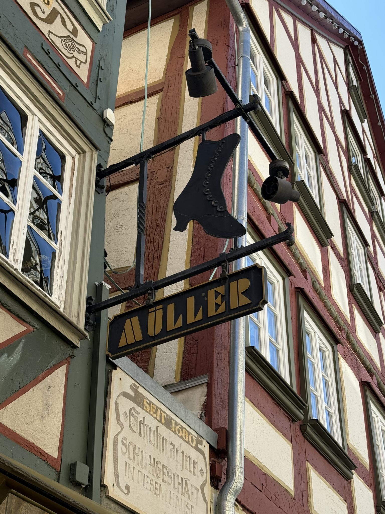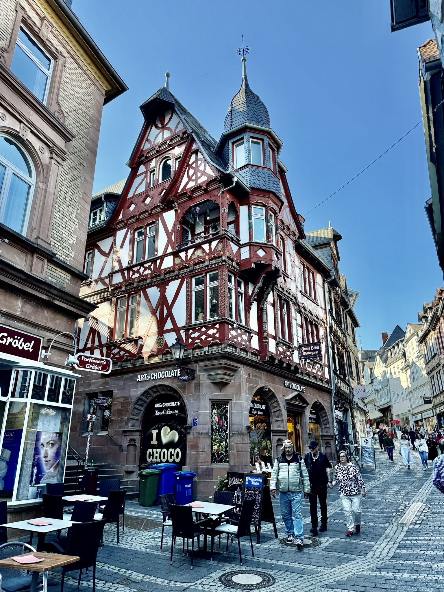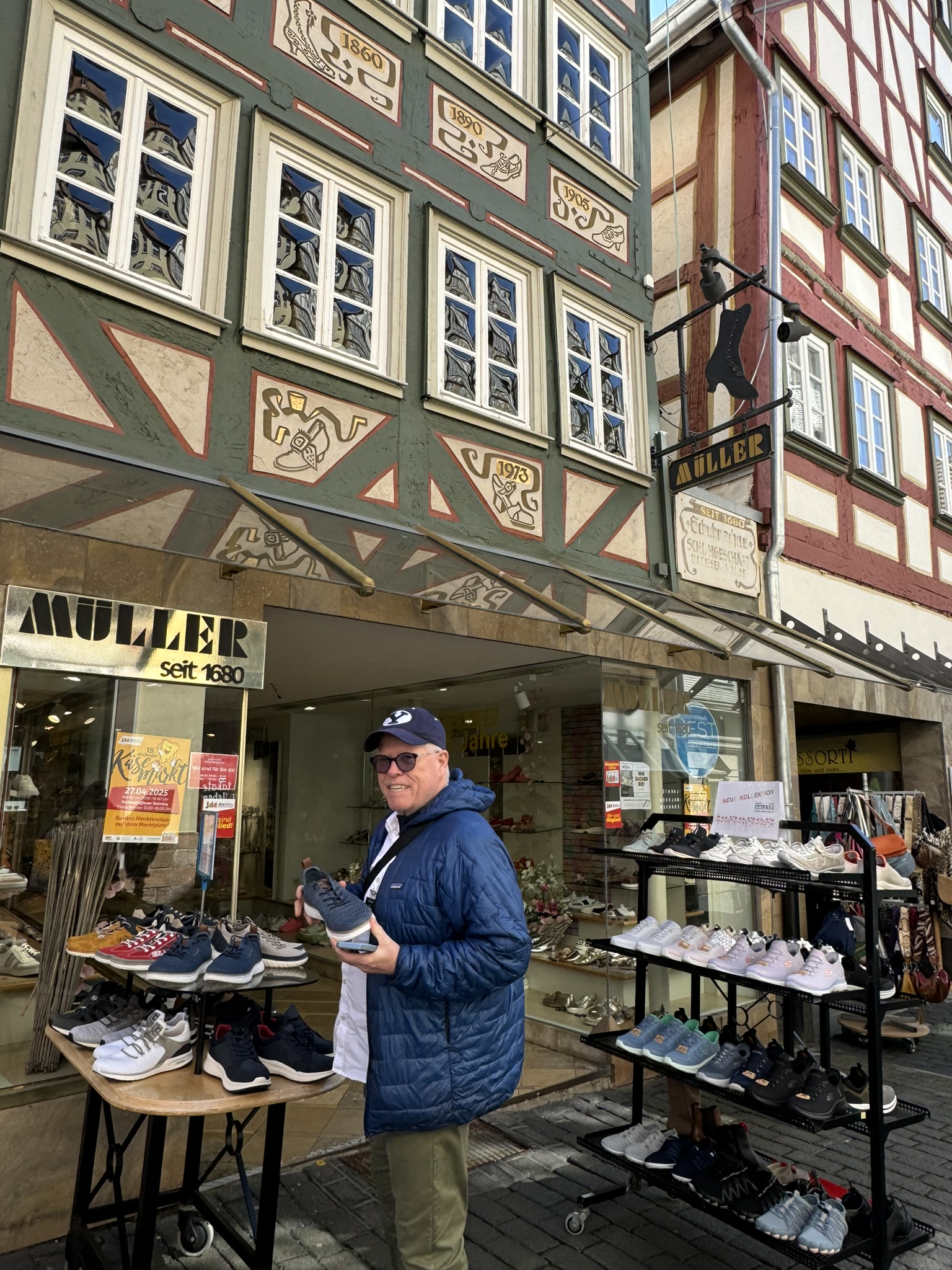 There are 400 half-timbered houses here. We did not encounter Little Red Riding Hood, but we found a Mother Goose fountain and Ed found a great pair of shoes.
