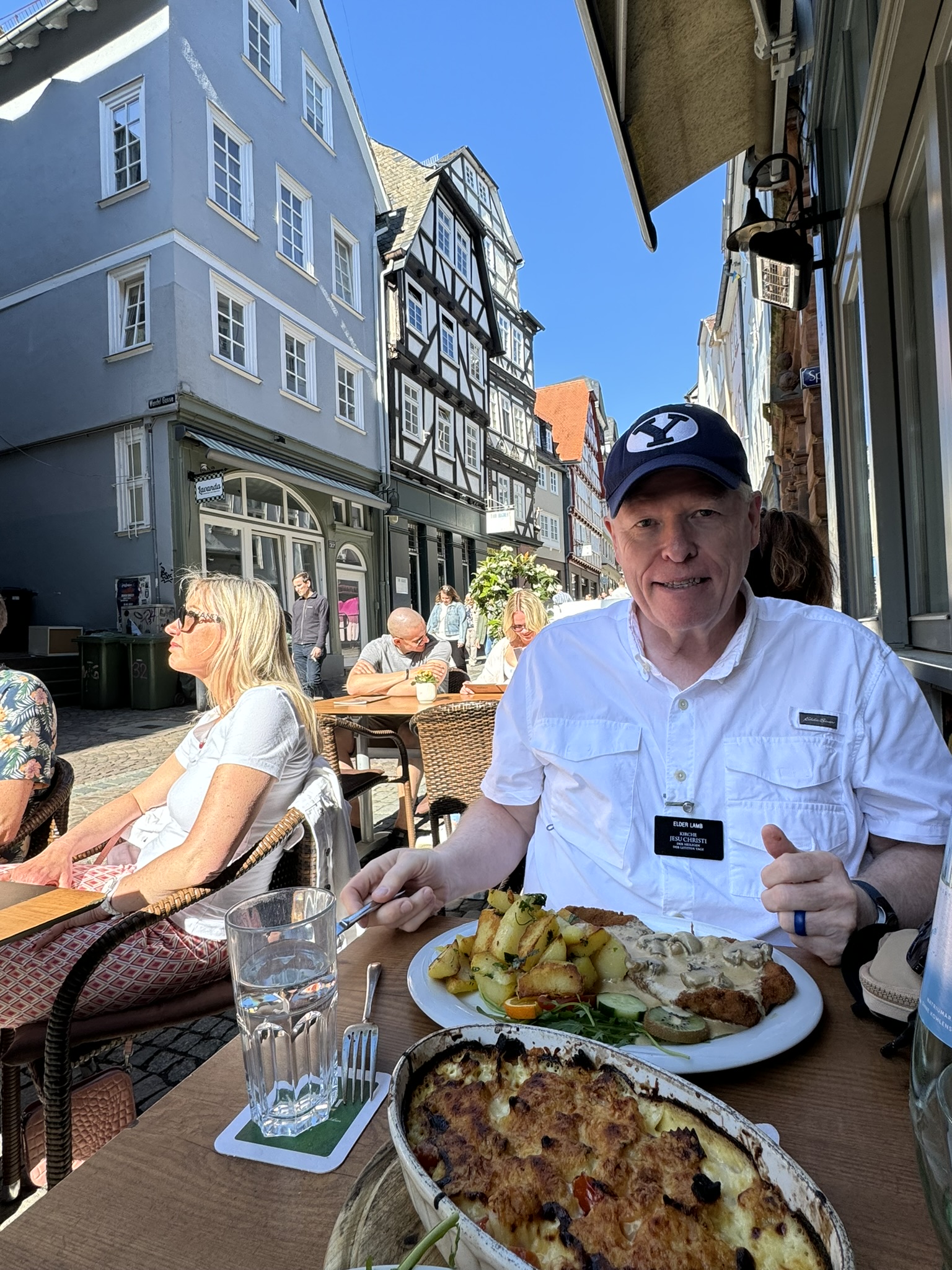 The miracles that come to mind this week involve parking and driving- two very stressful things in Europe. While in Marburg we dutifully followed our GPS up steep cobblestone roads with hairpin turns to get to the castle on the top of the hill. We came to a dead end, backed up and found a parking space on the street- the only one for miles. After our visit to the castle, we followed that same GPS which took us on a different route down the hill, on a one-way, no turning back adventure. The road was narrower, required that we squeeze through old city wall gates and turn sharp corners with just inches to spare. At the end of our white knuckle decent, we were spit out into a pedestrian zone. We inched our way through sidewalk cafes and hundreds of pedestrians who shook their heads at us. At the first intersection, two kind ladies approached our car. They spoke English and told us that from 11am-3pm on Saturdays this Market Platz area turned pedestrian, a fact our GPS was incapable of knowing. They smiled and told us there was no turning back, that we must inch our way through the crowds for 500 meters driving straight ahead and then we would find a small parking lot on the left. They told us to expect angry people, hoped that there were no police in the vicinity, and wished us luck. To us they were angels standing on the corner at just the moment we needed help. It was a long 500 meters! Just as the ladies said, there was a small parking lot at the end, but it was full. We were seriously contemplating whether to abort the rest of our trip and drive directly home, when we saw a couple walking to their car and voila we had a parking space! We breathed a sigh of relief, thanked Heavenly Father, and hoped no one recognized us as we ate at a sidewalk café we had just passed in our car. We tried a Marburg specialty called Auflauf (casserole) and then enjoyed the sites on foot.