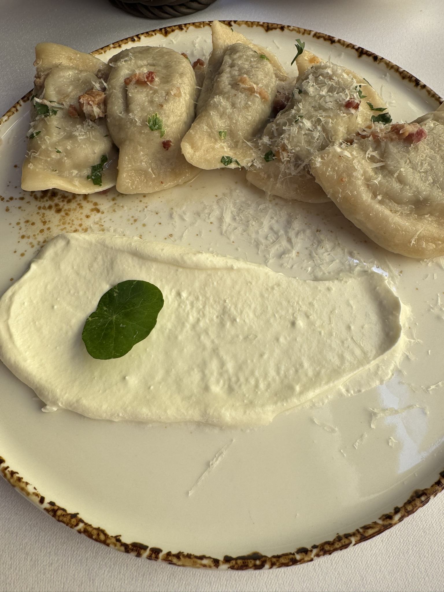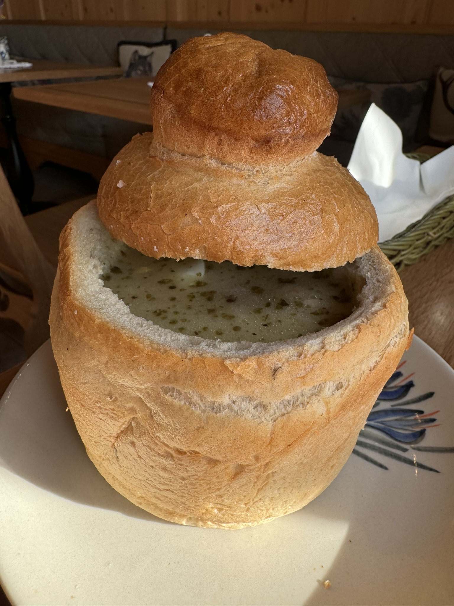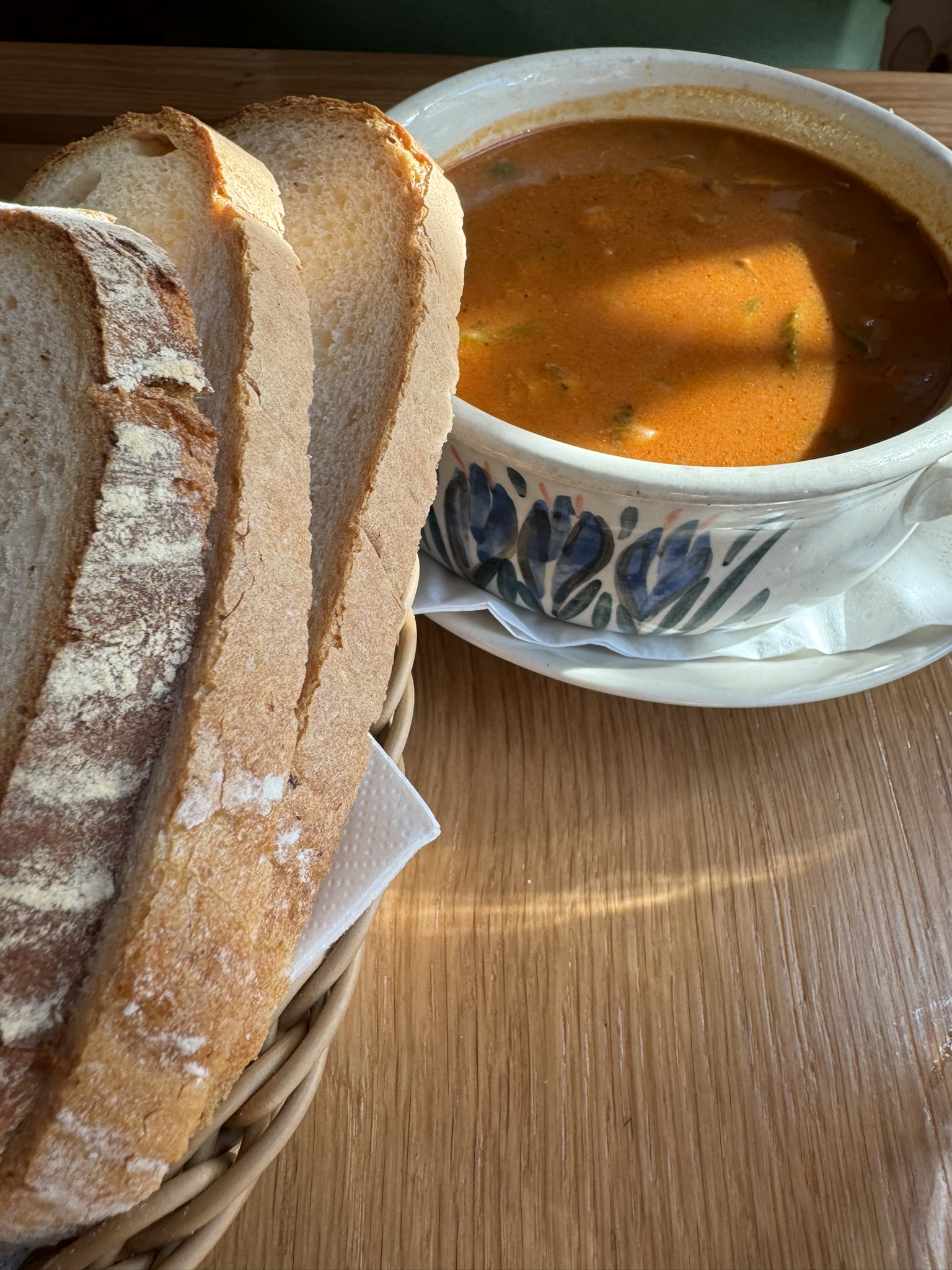 Goulash & Jajkiem (broth with hard boiled eggs & sausage, served in bread)