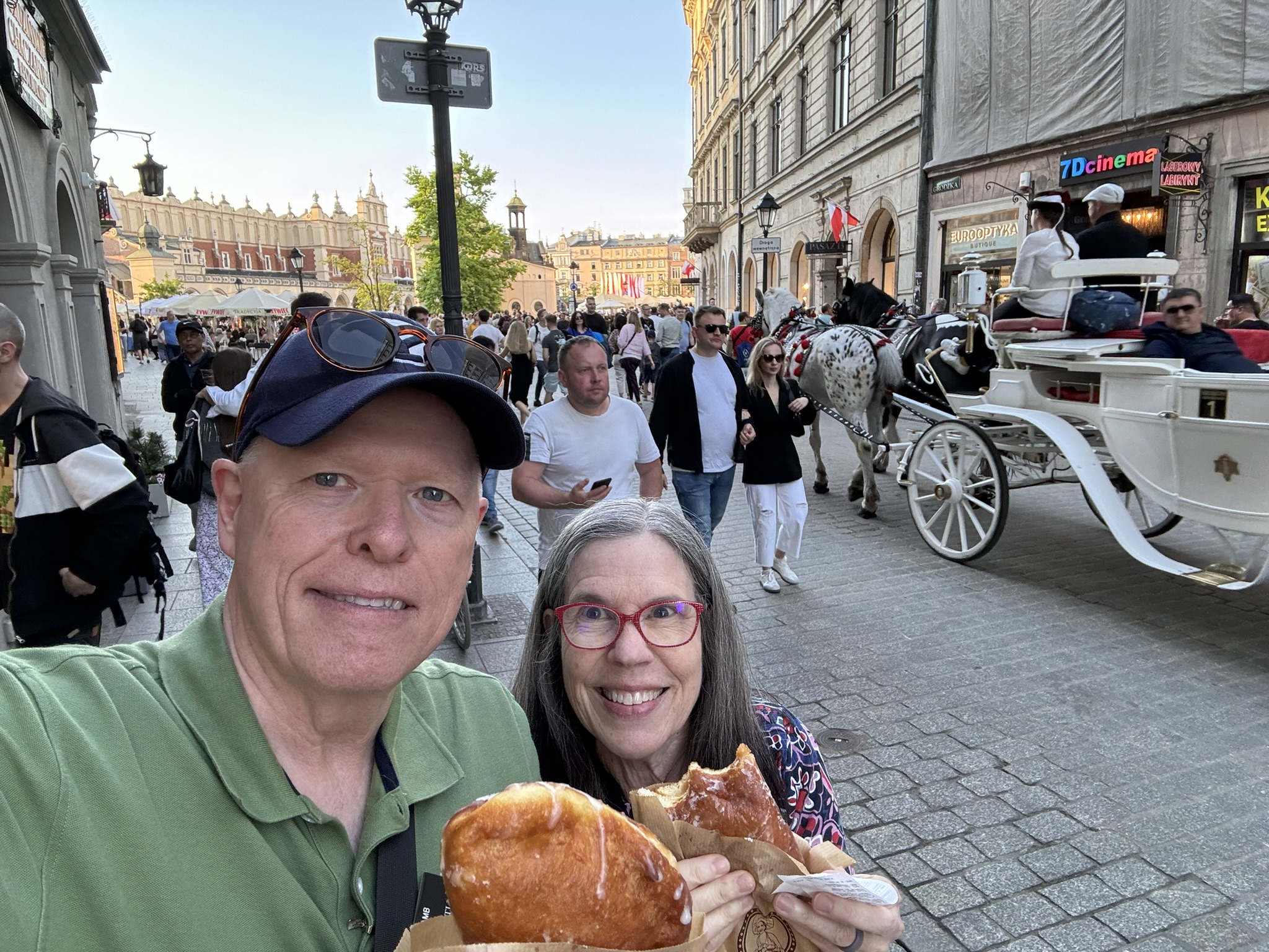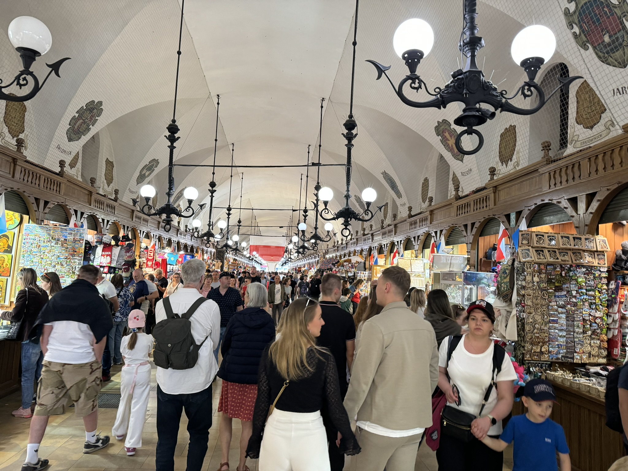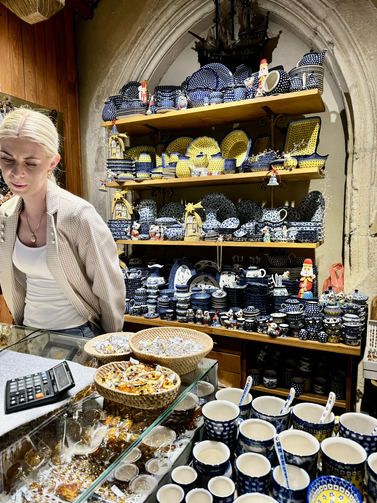 Krakow boasts Europe’s largest medieval market square known as Rynek Glowny. The old town of Krakow is designated as a UNESCO world heritage site. This 13th century square is surrounded by historic townhouses and features the iconic Cloth Hall which has been the heart of the city’s trade for centuries. A knife hangs at the entrance to warn thieves. During medieval times the first time a thief was caught, the end of his/her nose was cut off. The second and third time it was the ears. If there was a future infraction off with their head. We found some Polish pottery here we could not resist and did not encounter any thieves.
