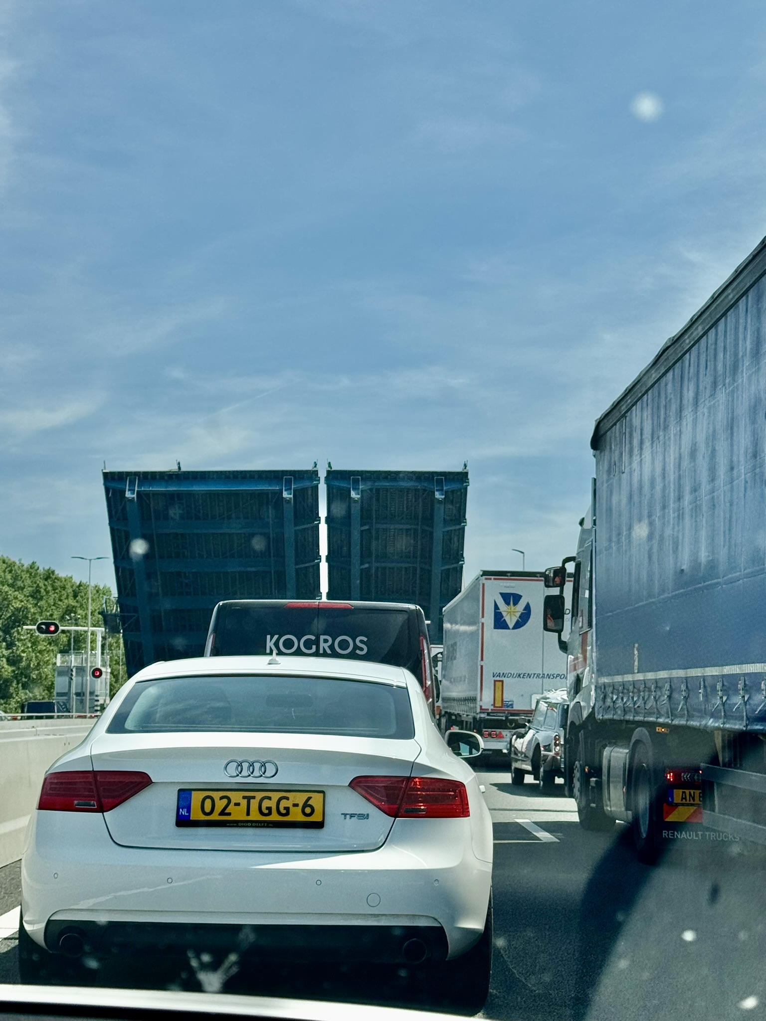 Our 4 ½ hour drive from Frankfurt turned into 6 ½ hours with terrible traffic and detours through the countryside. It is against the law for trucks to drive on holidays and Sundays in Germany so you would think the roads would be clearer. Hundreds of trucks are parked in rest stops all through the country to wait until 10pm when they can be on the road again. Once we got into the Netherlands the delays were caused by canal bridges being raised so ships could pass through. One interesting bridge pivoted instead of raising.