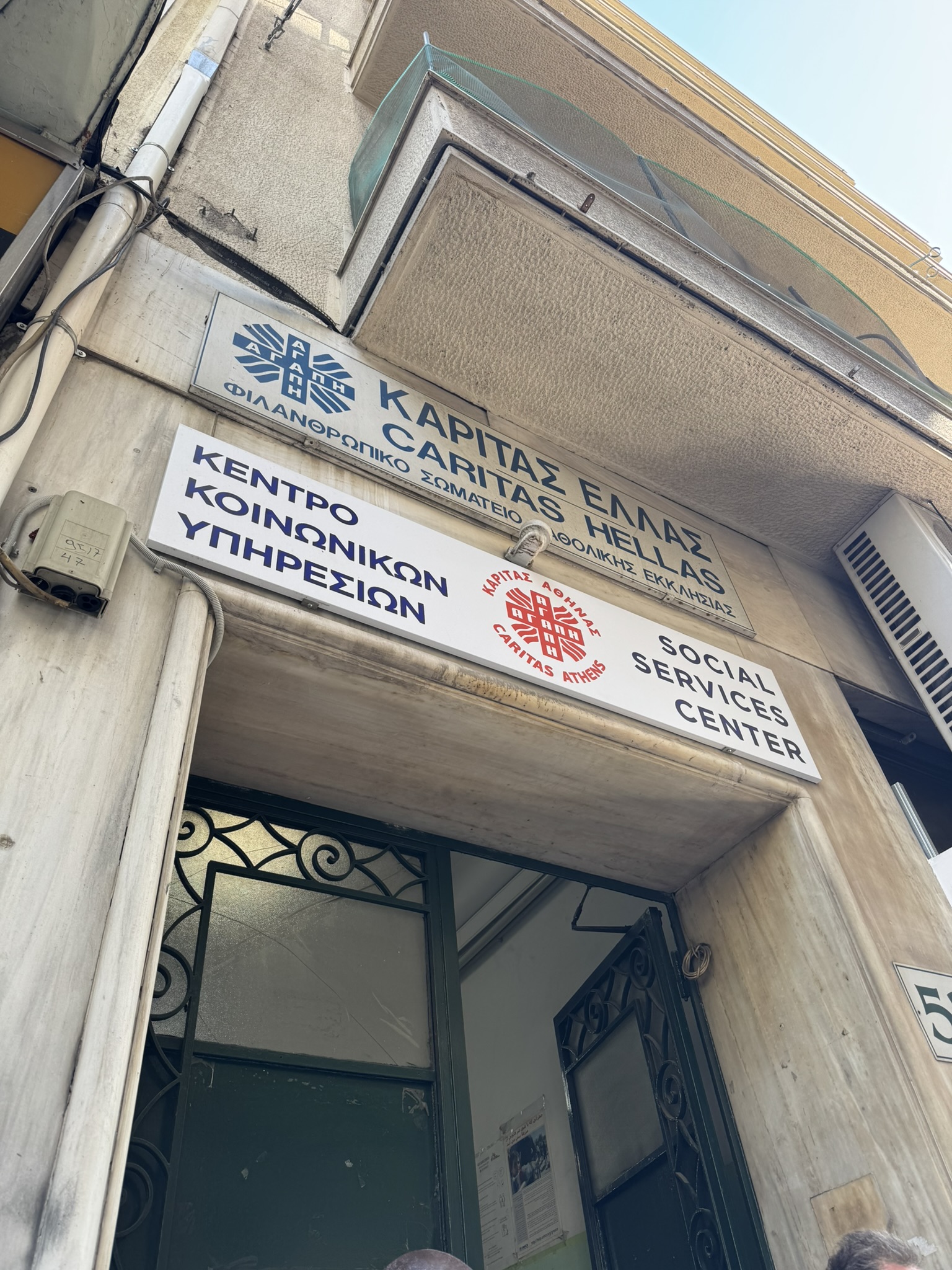 Caritas is the faith-inspired social welfare network of the Catholic church. At this location they provide 200 people with a daily meal service, with access to clothing, and Greek and English lessons. Social workers serve refugees, the elderly, and the homeless in their neighborhood.