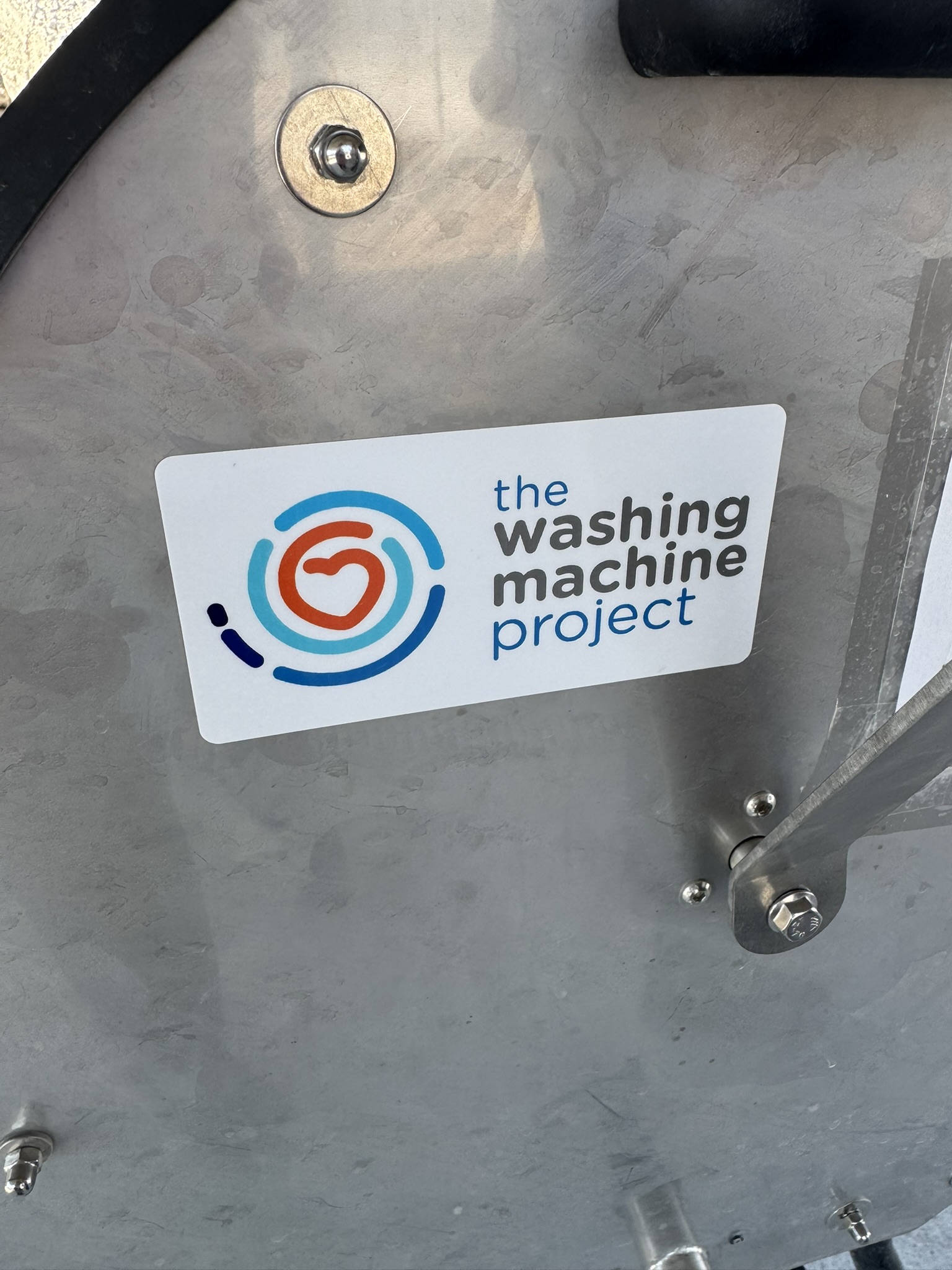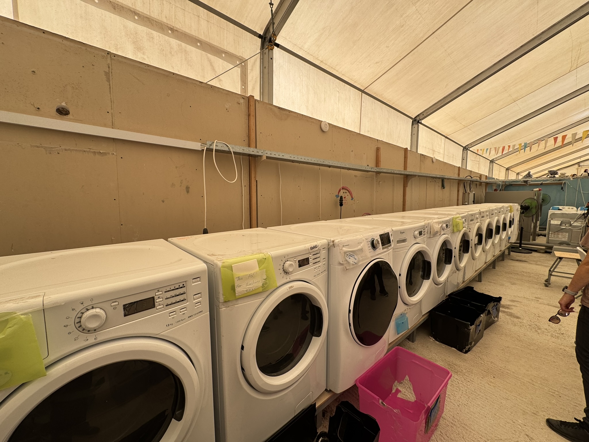 In the laundry room one employee is assisted by volunteers to wash camp blankets and to do laundry for individuals living at the camp. An ID card follows each load through the washing and drying process. Residents drop off their dirty laundry and it is ready to pick up within 12 hours.