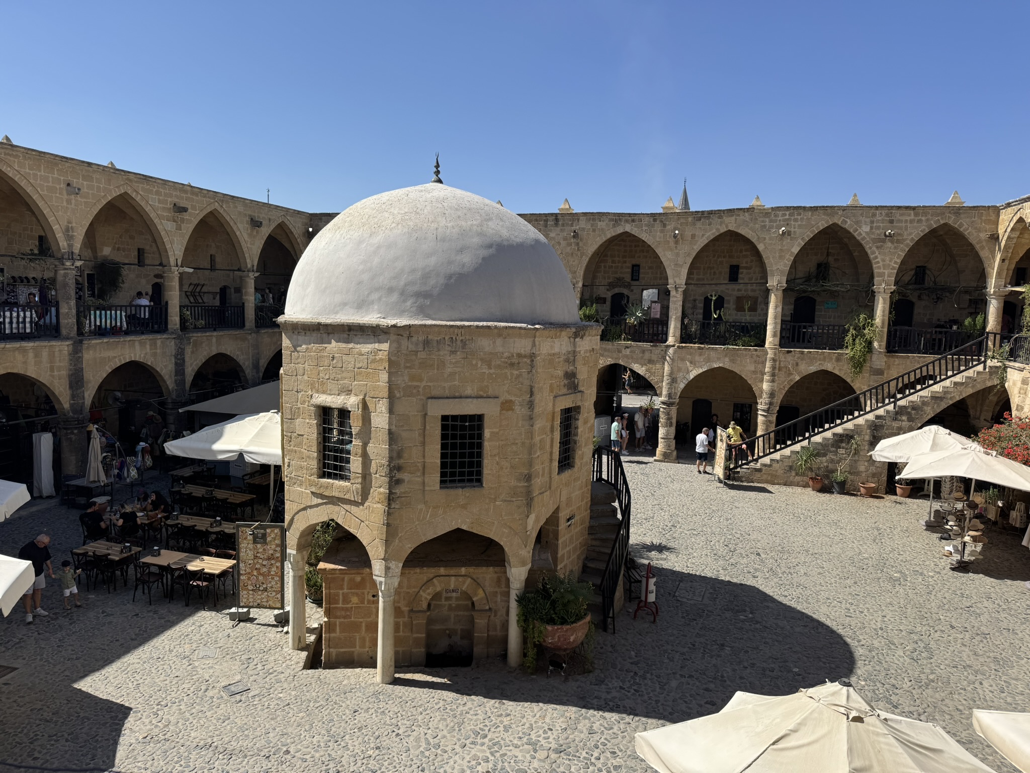 We saw a caravansary turned shopping mall, a mosque, and a market. A caravansary was an inn with a central courtyard for travelers and their animals as they traveled through the desert. These inns were spaced a days journey apart.