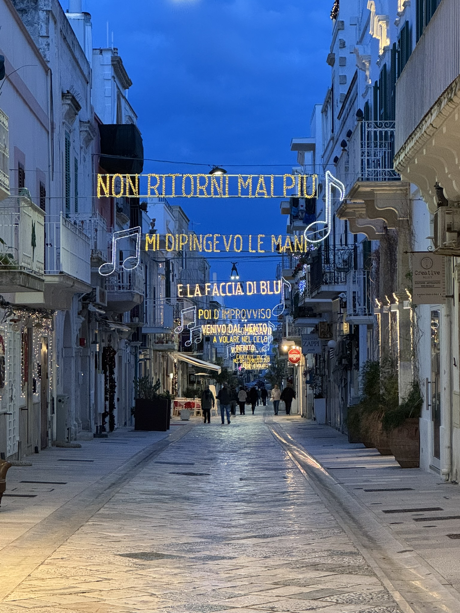 We visited the Domenico Modugno statue and then walked the streets reading the lyrics in lights and singing the song he is famous for, Volare.