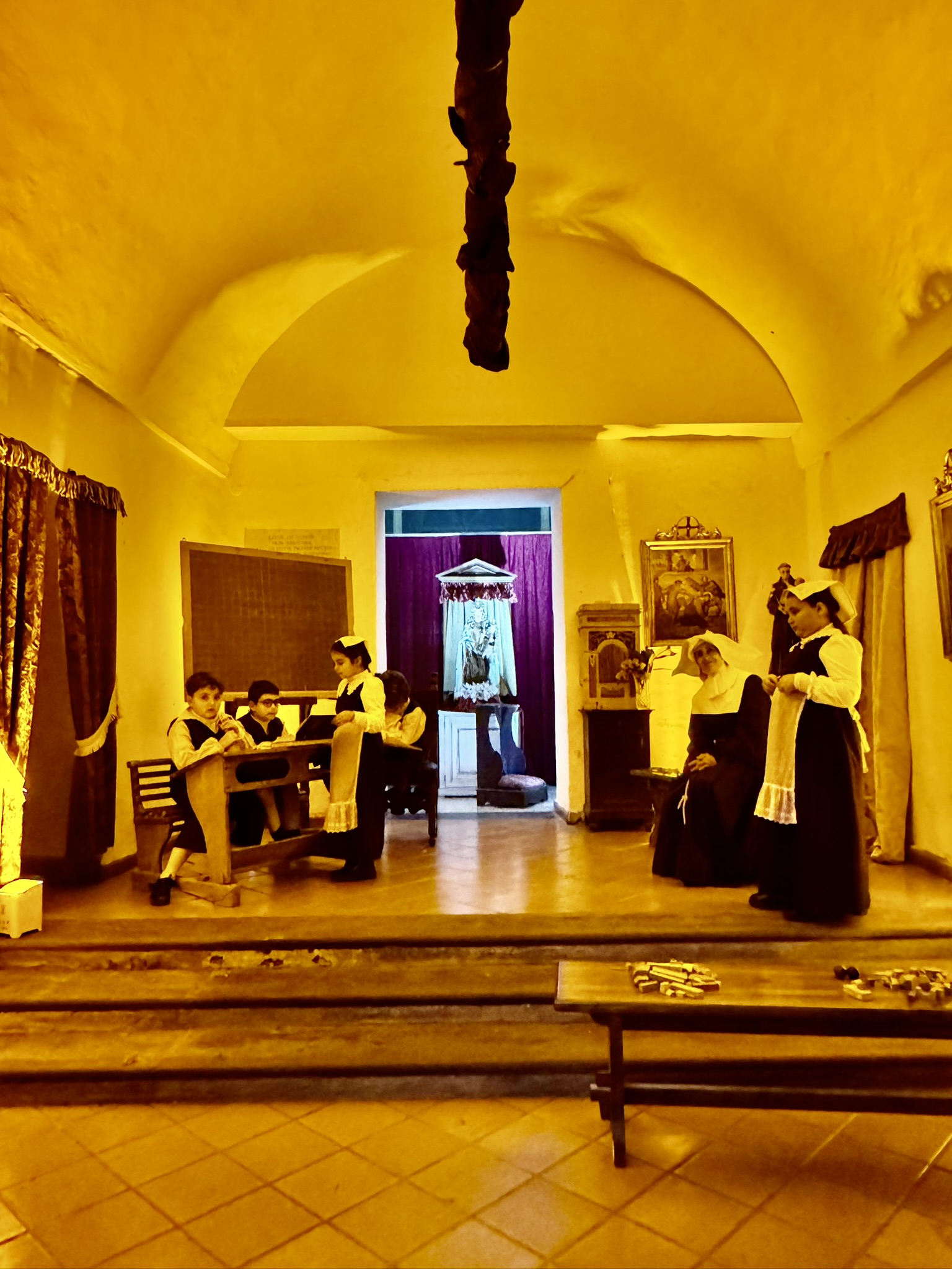We happened upon another presepio although what led to the nativity were not scenes from the Bible but vignettes from Sorrento’s noblemen’s history: families gathered in celebration, school children in the classroom, a marketplace alive with sales, washerwomen dancing, craftsmen at work, musicians, and citrus orchards being harvested.